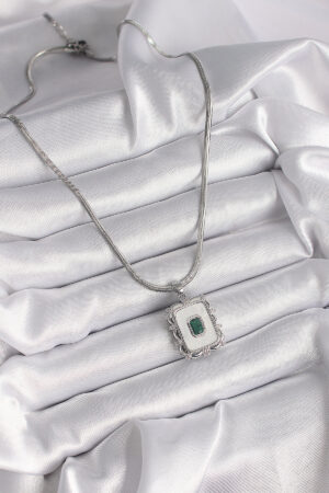 316L Çelik Gümüş Renk İtalyan Zincir Beyaz Sedefli Kare Portre Model Zümrüt Taş Detay Kadın Kolye
