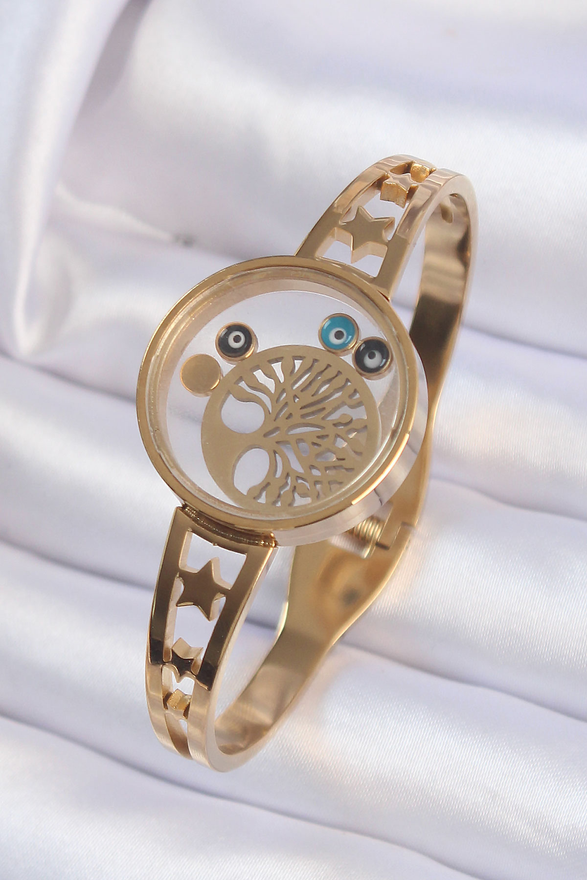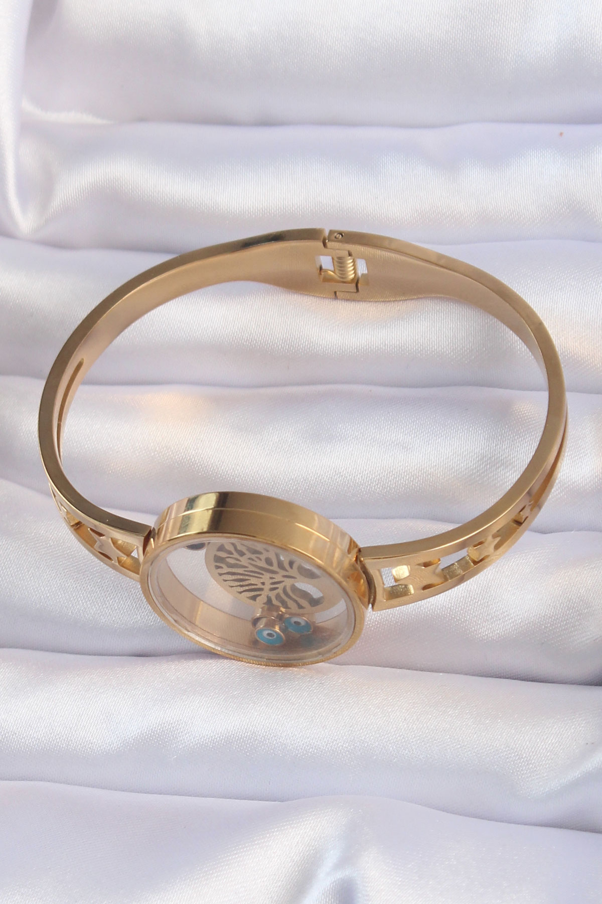 316L Çelik Altın Renk İçi Yaşam Ağacı ve Nazar Boncuk Figürlü Açılabilir Fanus Kelepçe