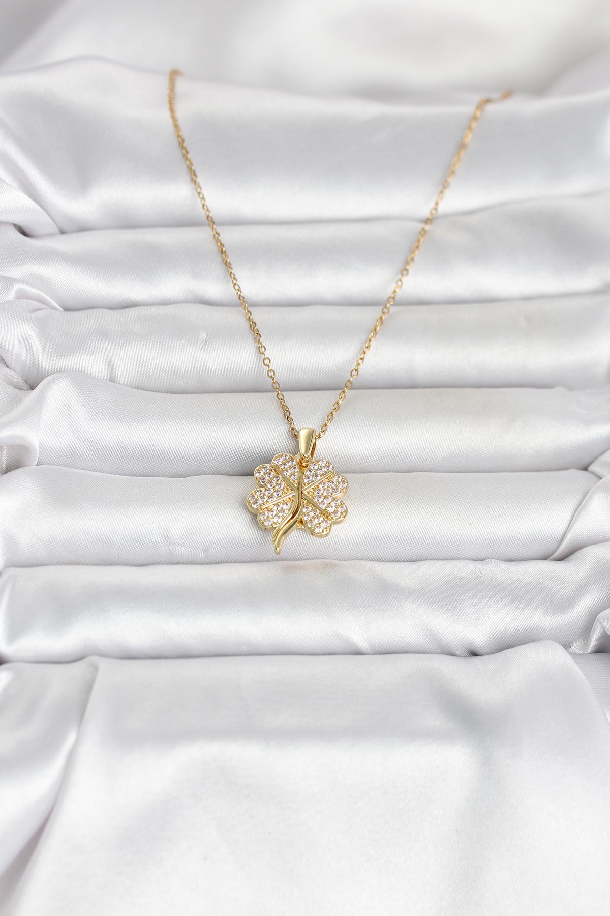316L Çelik Gold Renk Açılabilir Yonca Model Zirkon Taşlı Kadın Kolye