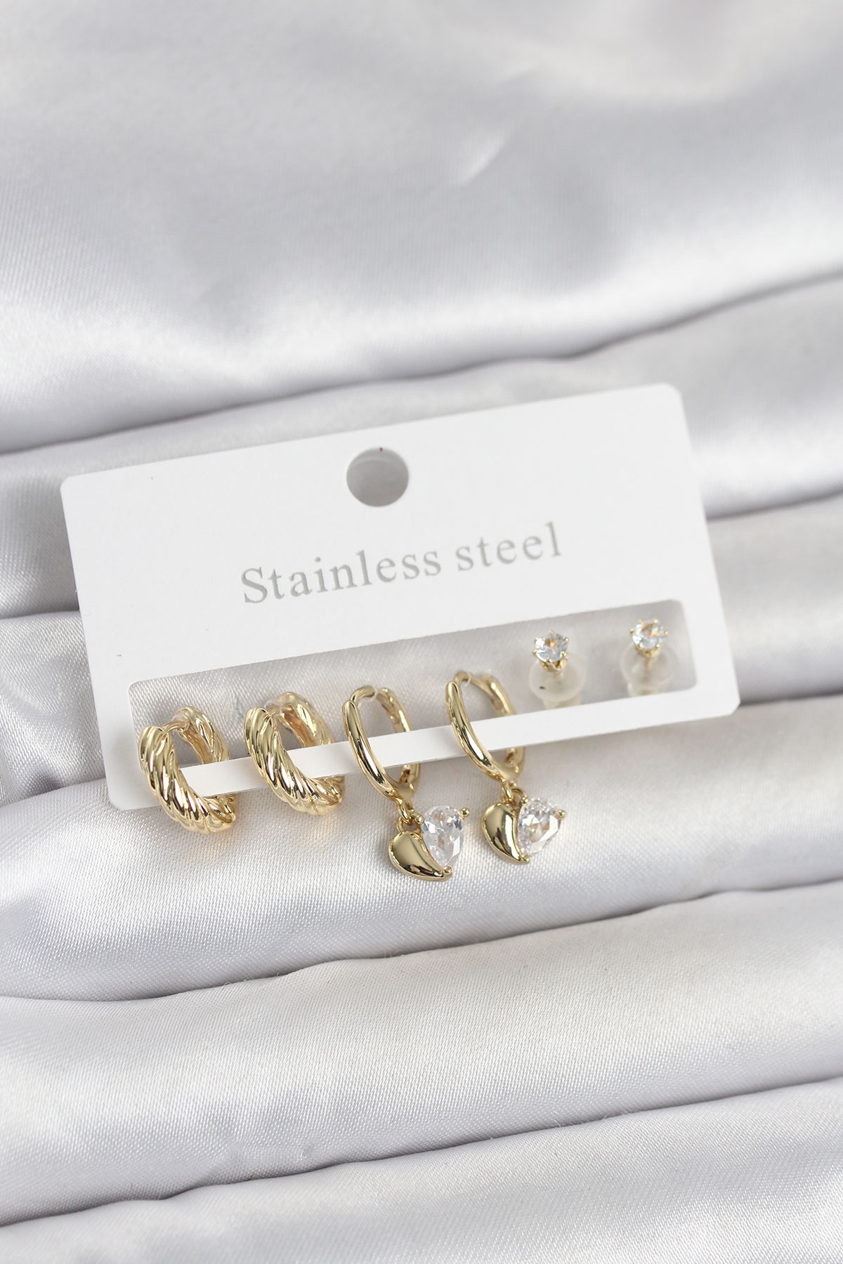 316L Çelik Gold Renk Kalp Detaylı Kadın Küpe Seti