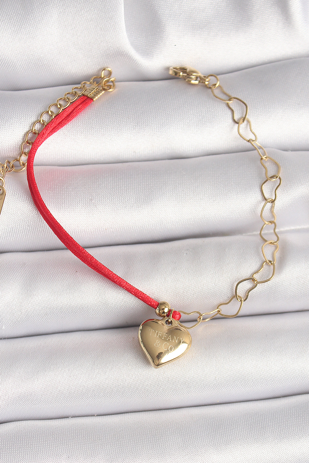 316L Çelik Gold Renk Zincir Kırmızı İp Model Sallantı Kalp Figür İşleme Detaylı Kadın Bileklik