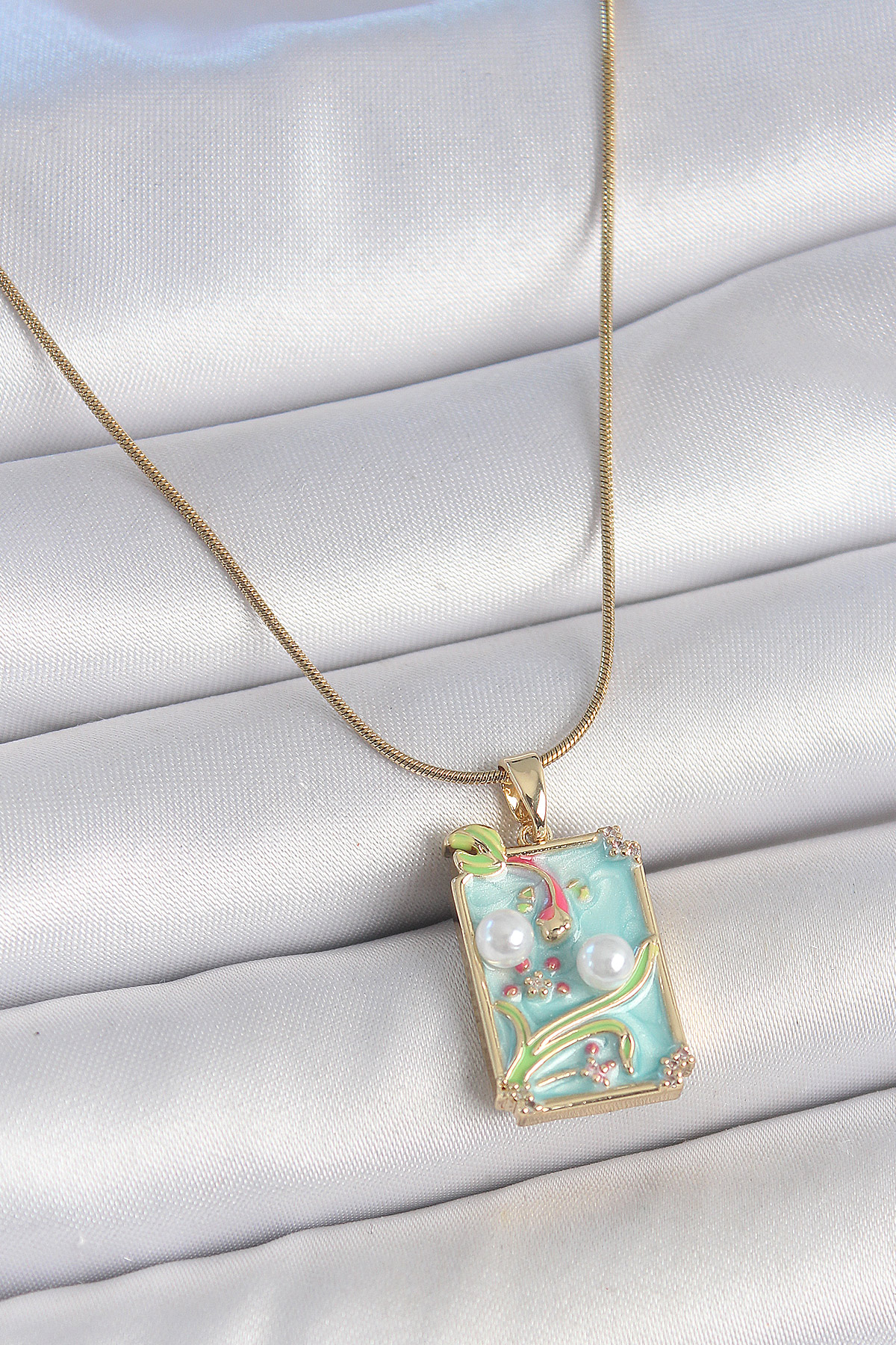 316L Çelik Gold Renk Zincir Mavi Mineli İncili Çiçek İşlemeli Portre Model Kadın Kolye