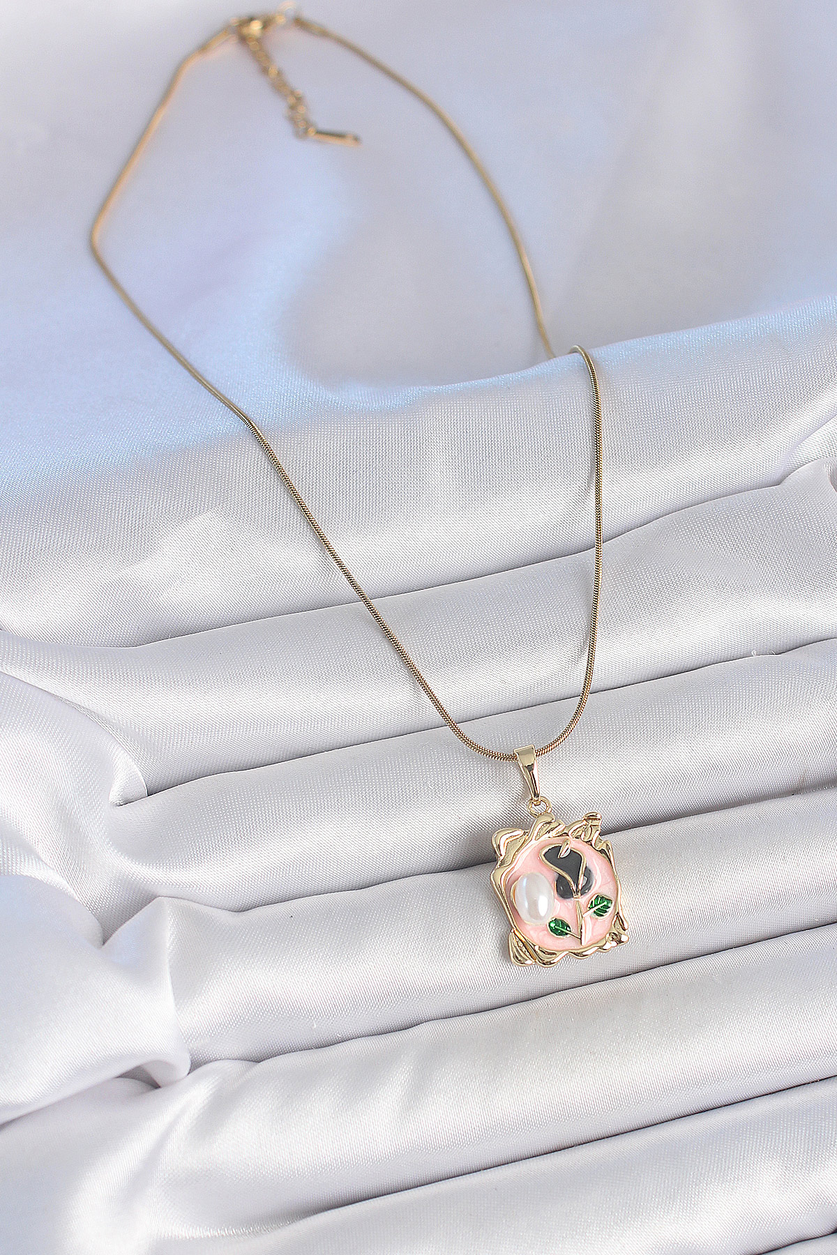 316L Çelik Gold Renk Zincir Pembe Mineli Çiçek İşlemli İnci Detay Portre Model Kadın Kolye
