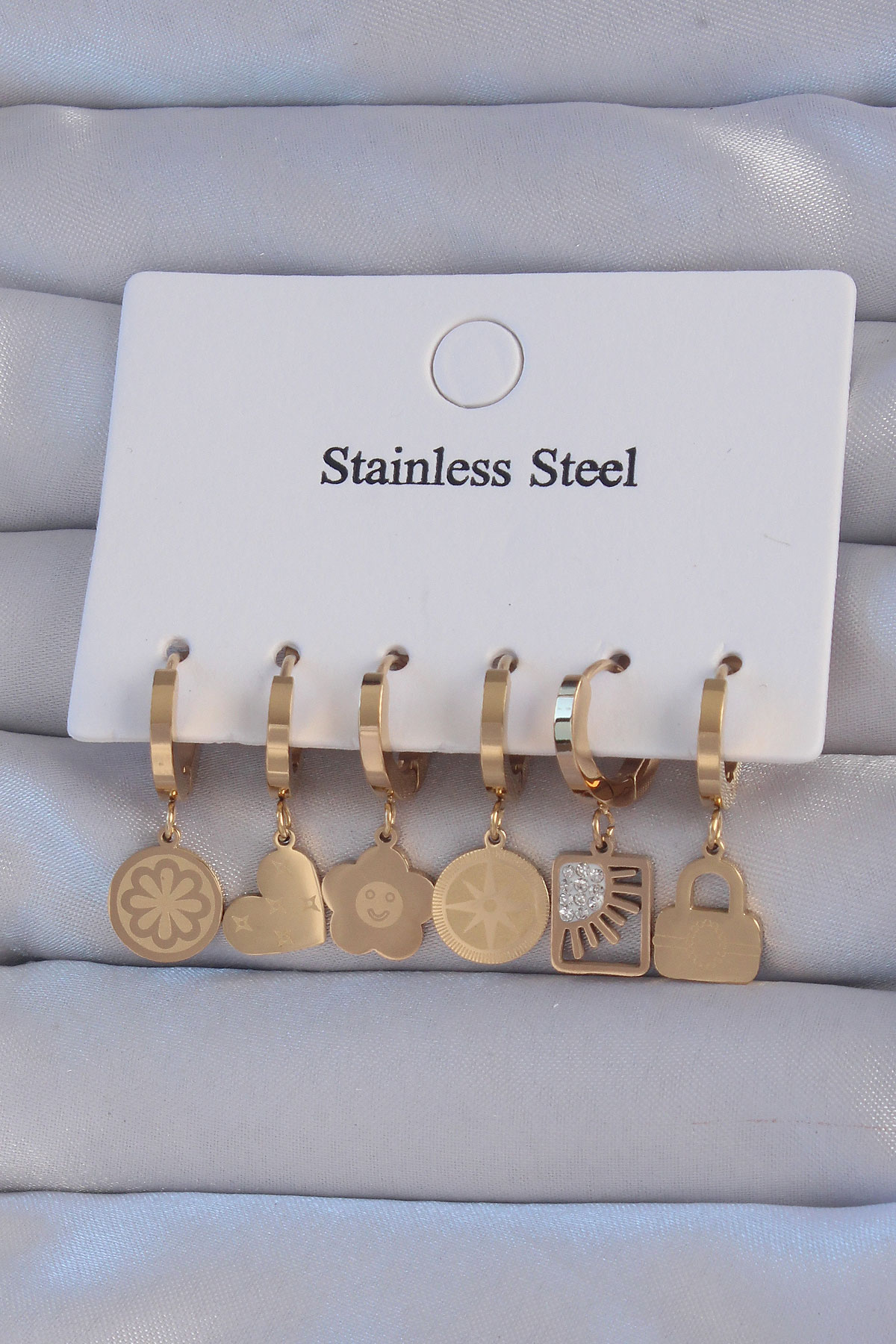 316L Çelik Gold Renk Zirkon Taşlı Çiçek Figürlü Kalp Model Halka Küpe Seti