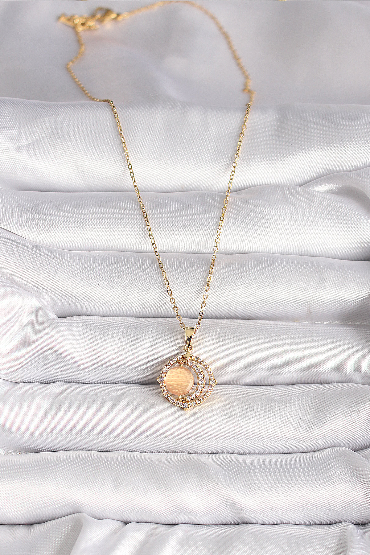 316L Çelik Gold Renk Zirkon Taşlı Turuncu Sedefli Hilal Model Kadın Kolye