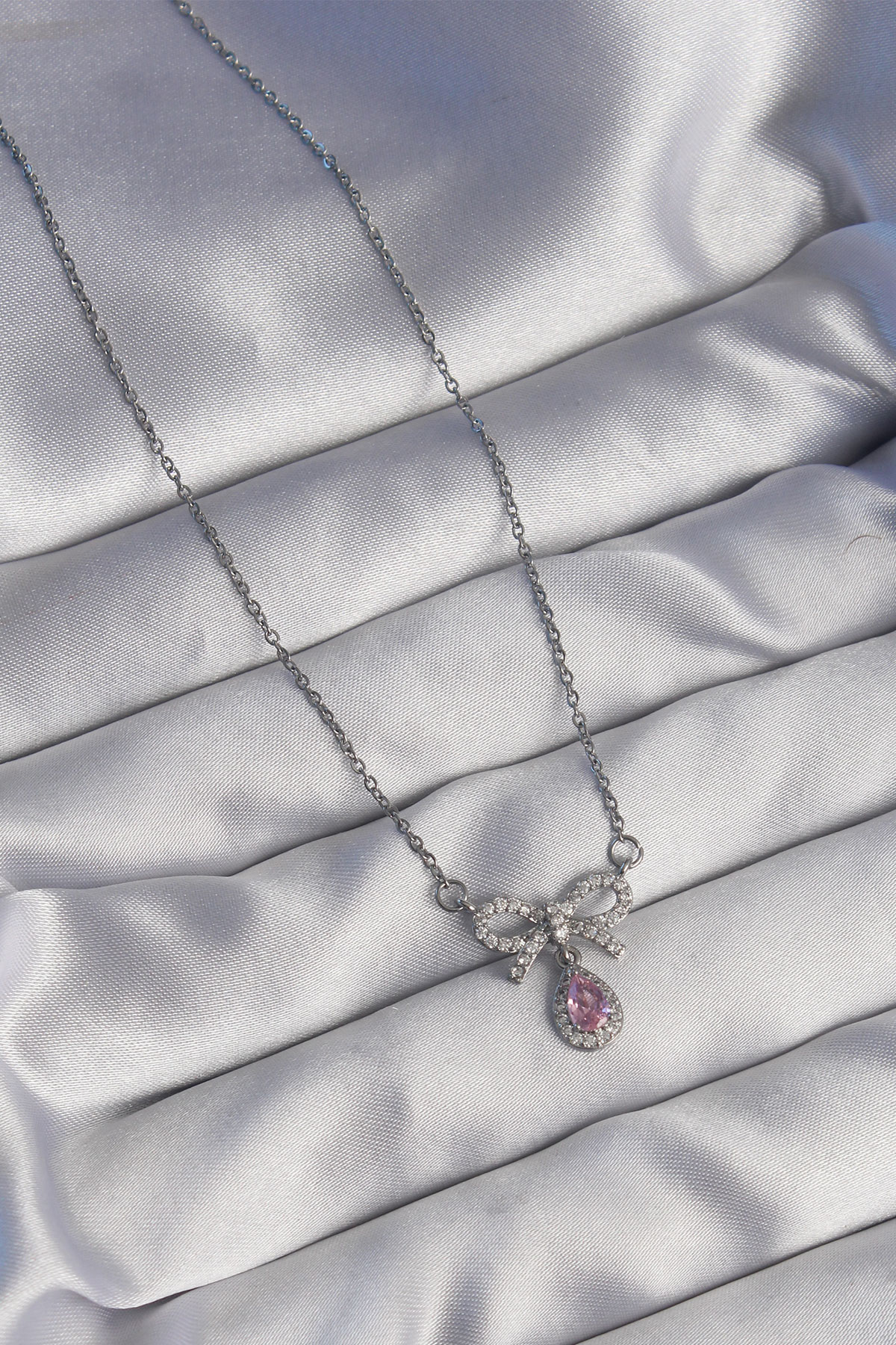 316L Çelik Gümüş Renk Fiyonk Detay Pembe Zirkon Taşlı Damla Kolye