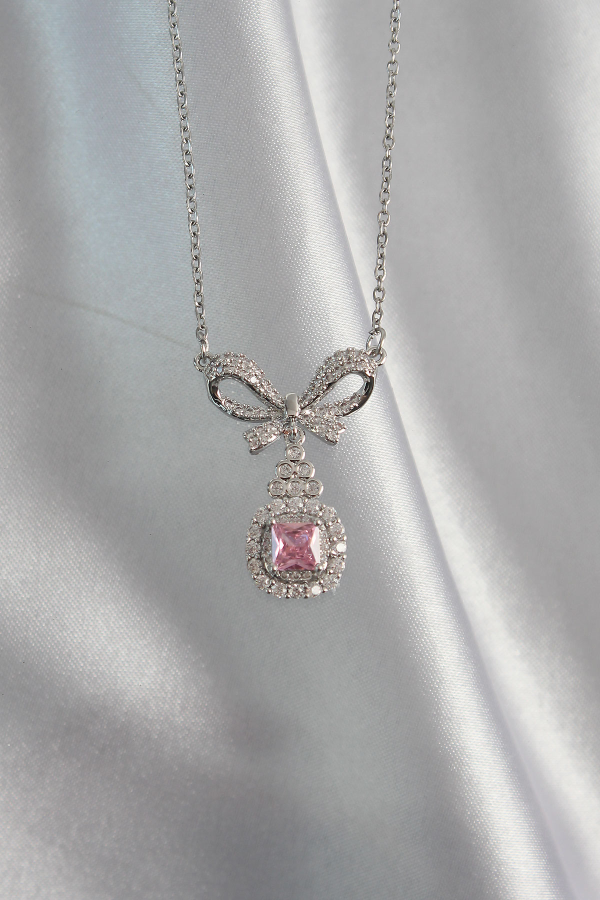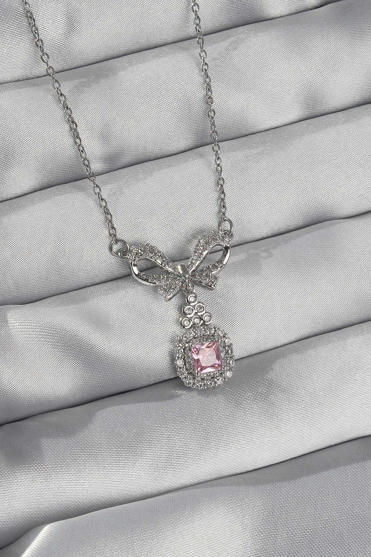 316L Çelik Gümüş Renk Fiyonk Detay Pembe Zirkon Taşlı Tektaş Kolye