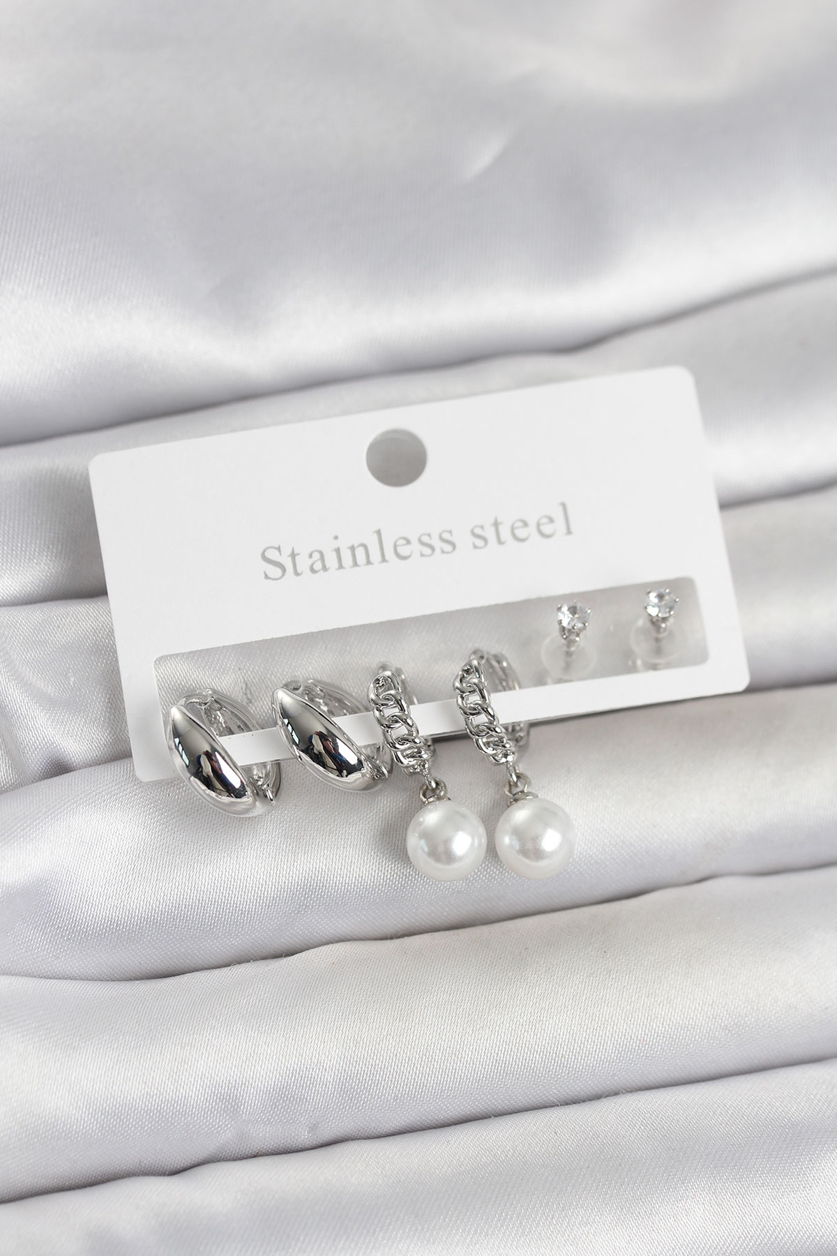 316L Çelik Gümüş Renk inci Halka Detaylı Kadın Küpe Seti