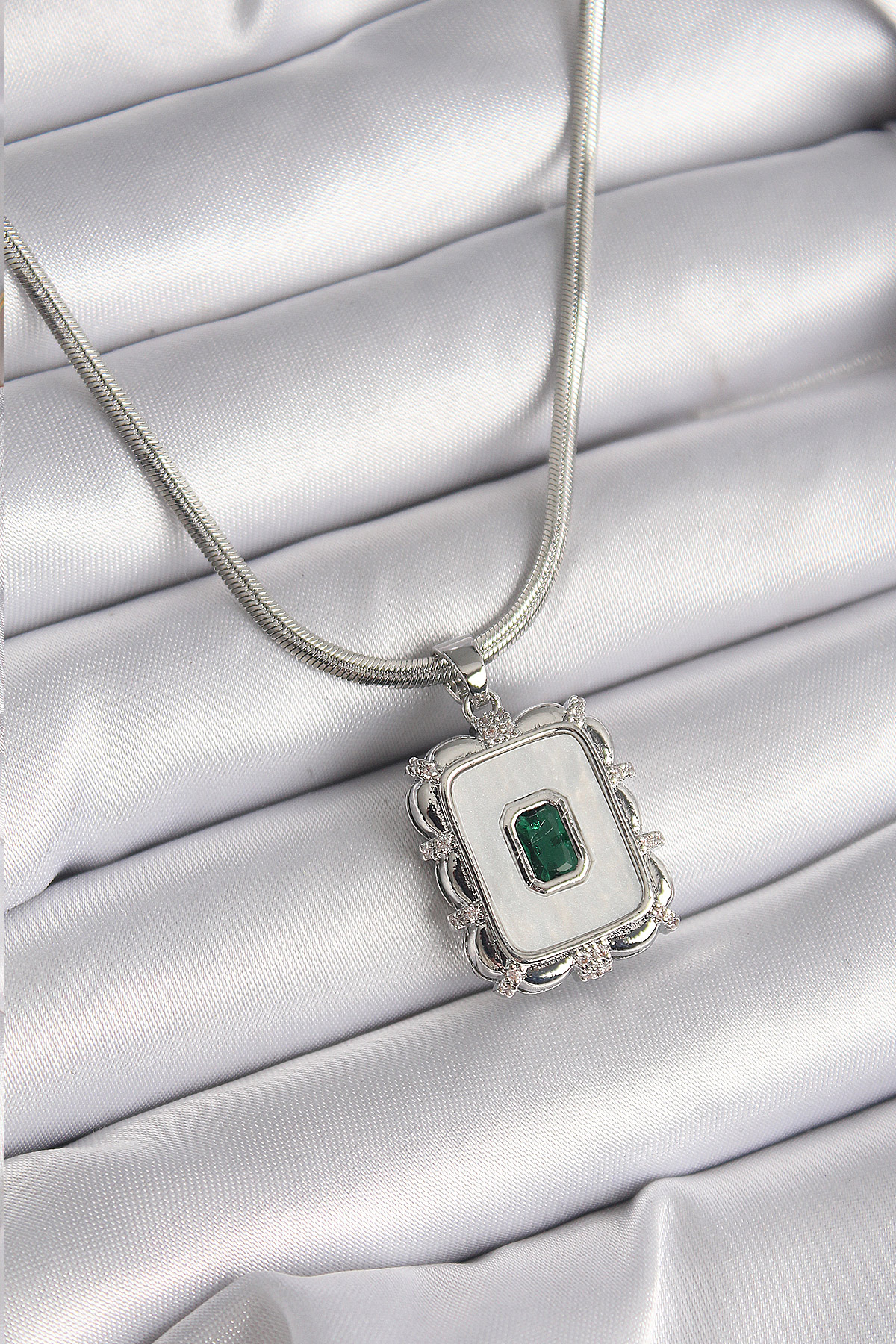 316L Çelik Gümüş Renk İtalyan Zincir Beyaz Sedefli Kare Portre Model Zümrüt Taş Detay Kadın Kolye