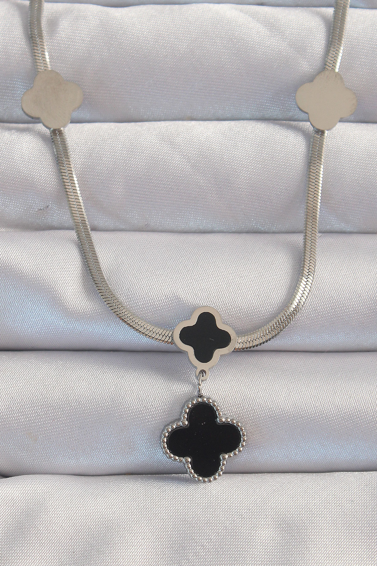 316L Çelik Gümüş Renk İtalyan Zincirli Mineli Yonca Kolye