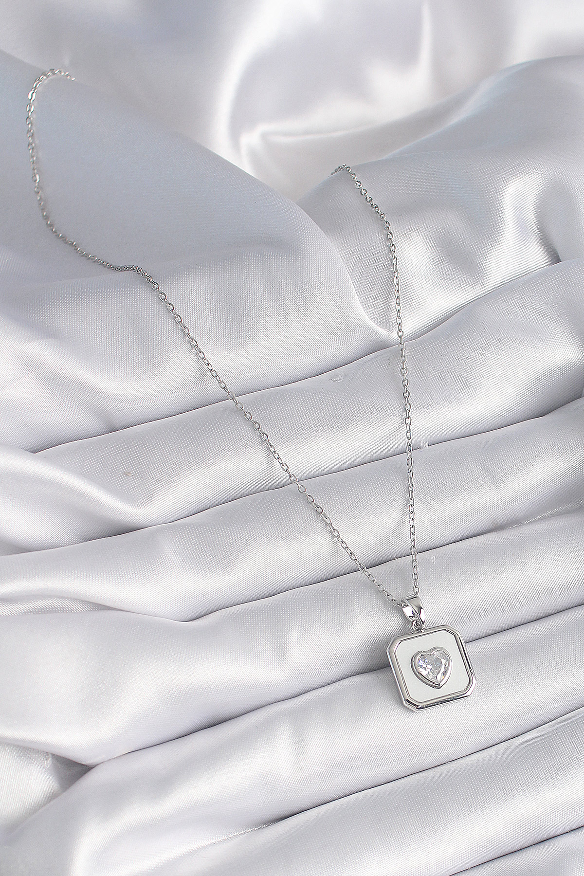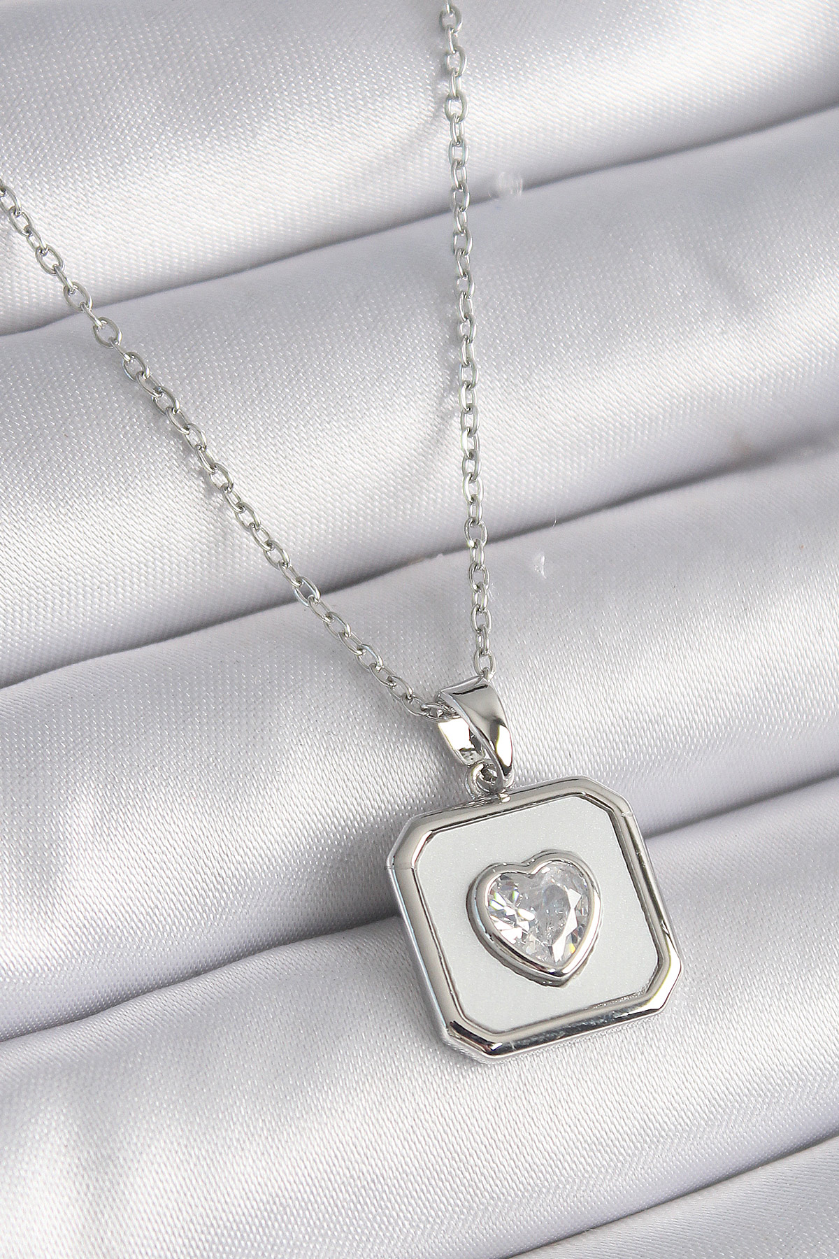 316L Çelik Gümüş Renk Kare Madalyon Kalp Zirkon Taş İşleme Kadın Kolye