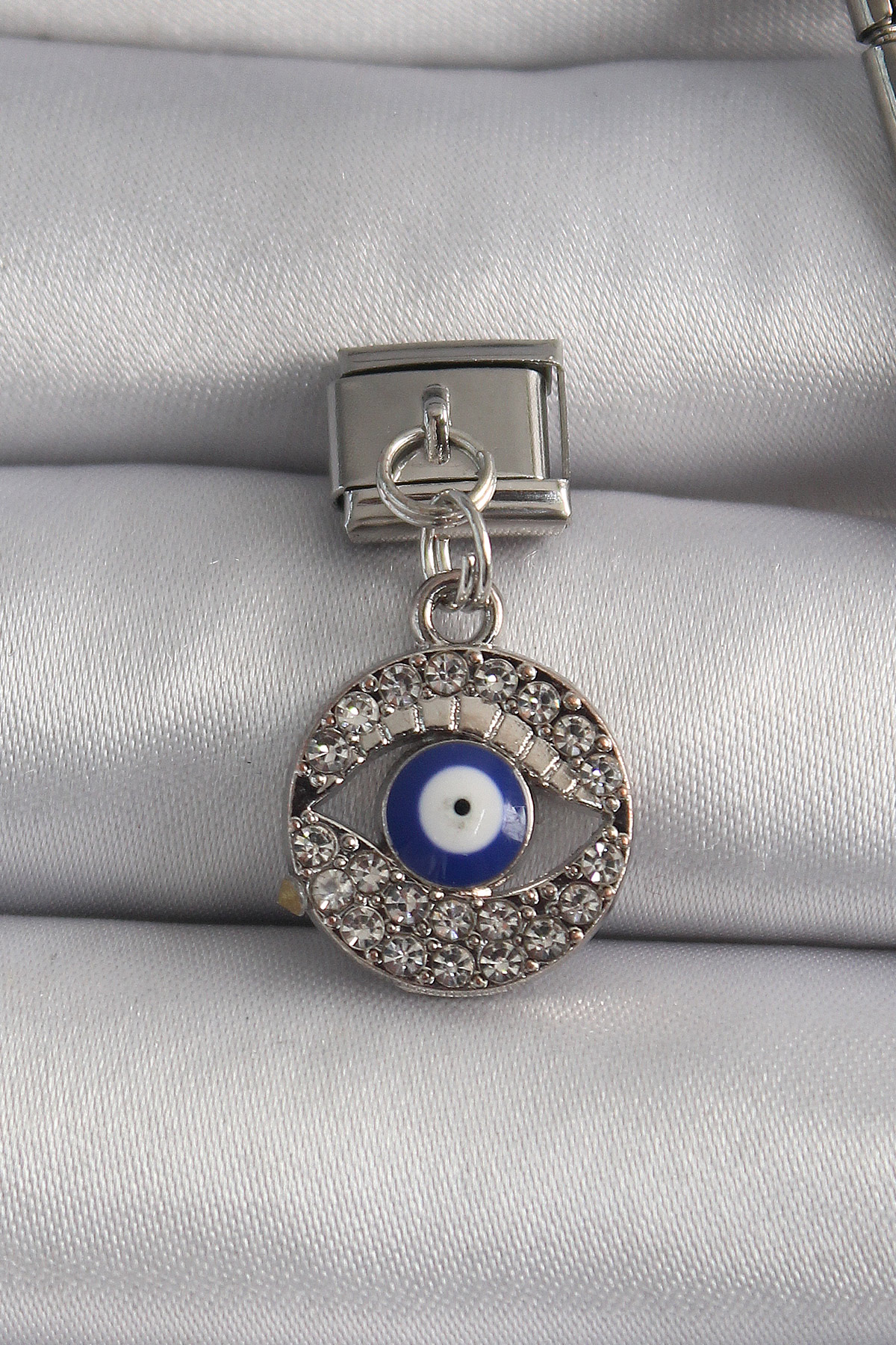 316L Çelik Gümüş Renk Sallantı Zirkon Taşlı Göz Model Nazar Boncuk Detay Nomination Charm