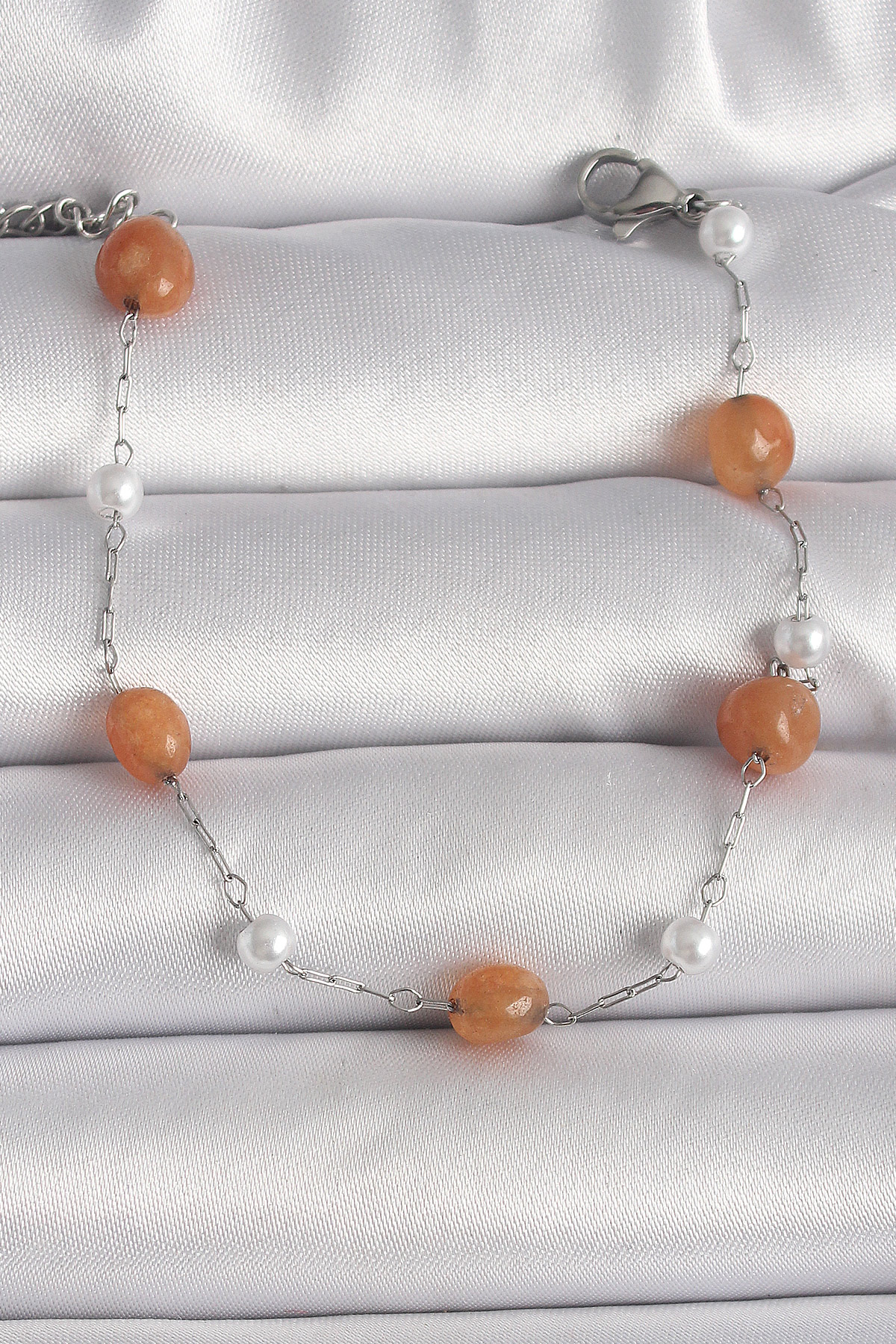 316L Çelik Gümüş Renk Turuncu Doğaltaş Model İnci Detay Kadın Bileklik