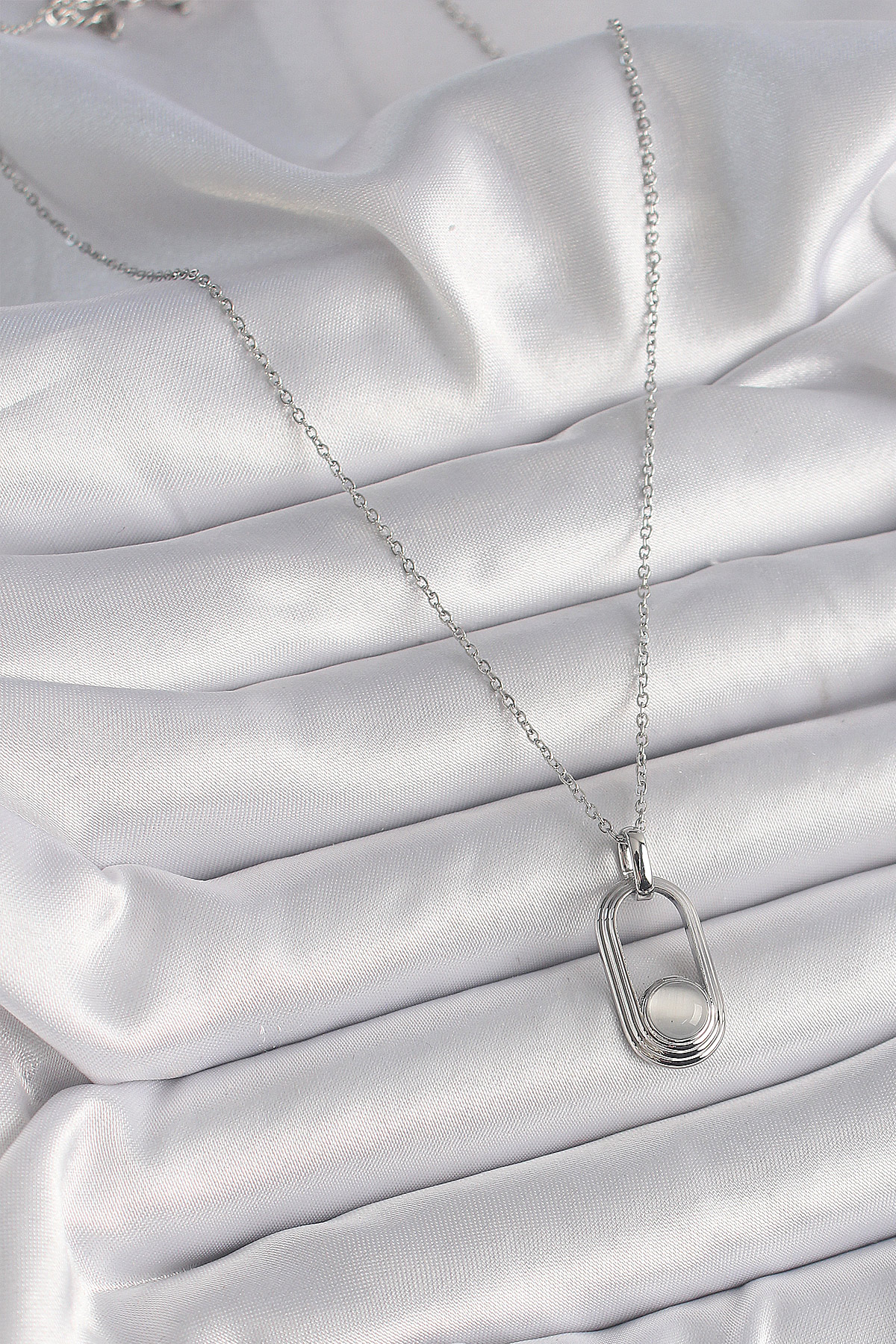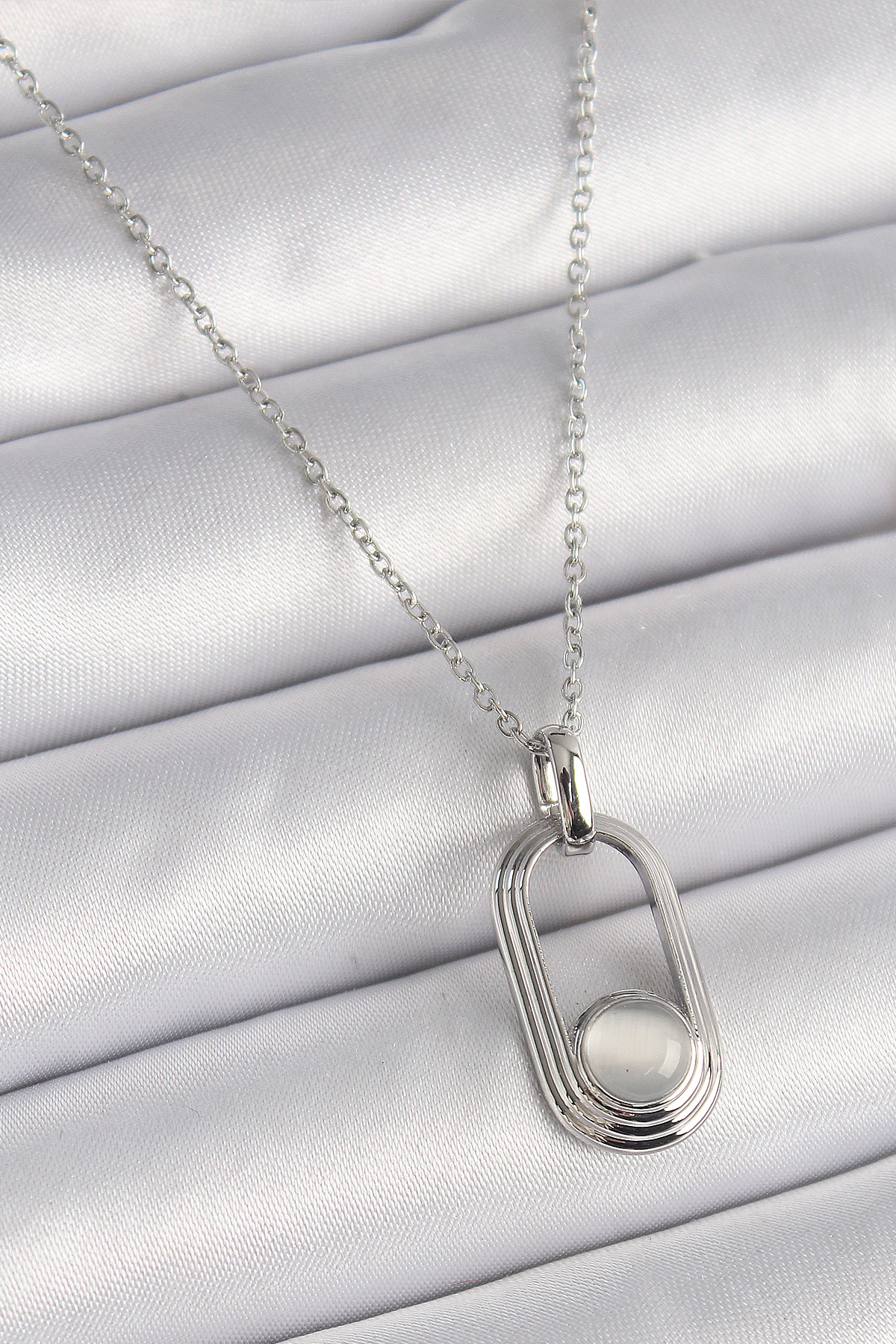 316L Çelik Gümüş Renk Zincir Beyaz Kedi Göz Model Kadın Kolye