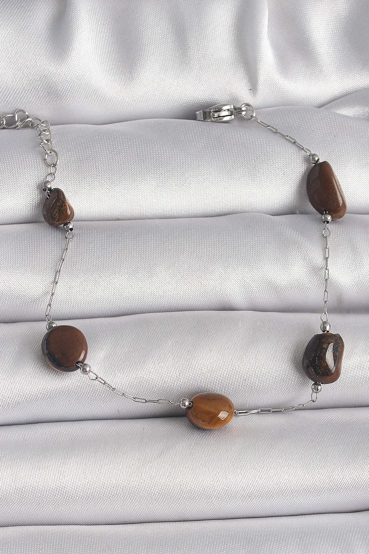 316L Çelik Gümüş Renk Zincir Kahverengi Doğaltaş Model Kadın Bileklik