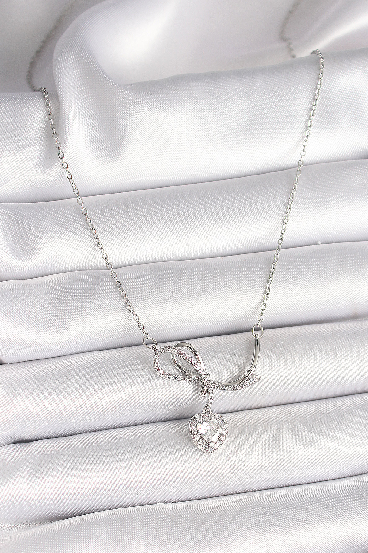 316L Çelik Gümüş Renk Zincir Zirkon Taşlı Düğüm Sallantı Kalp Figür Kadın Kolye