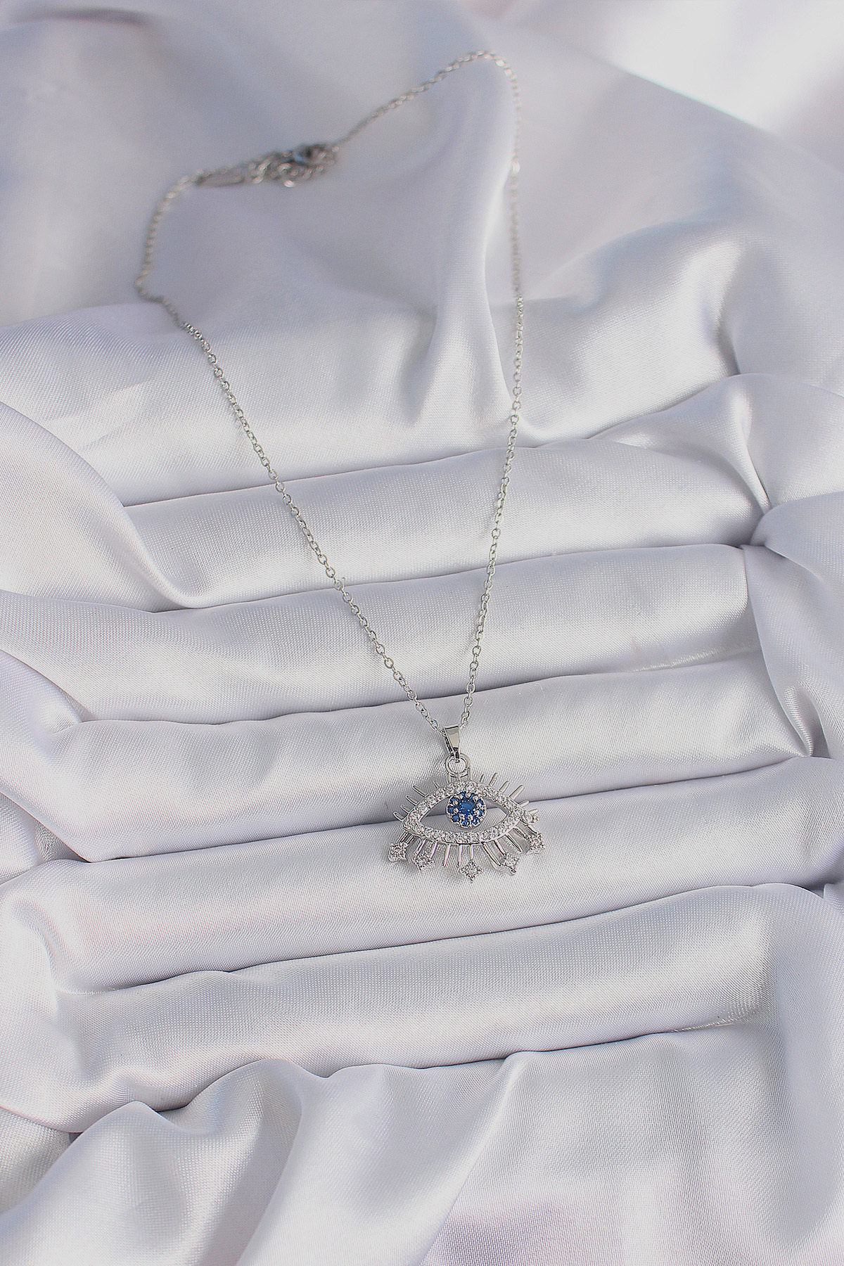 316L Çelik Gümüş Renk Zincir Zirkon Taşlı Göz Model Kadın Kolye