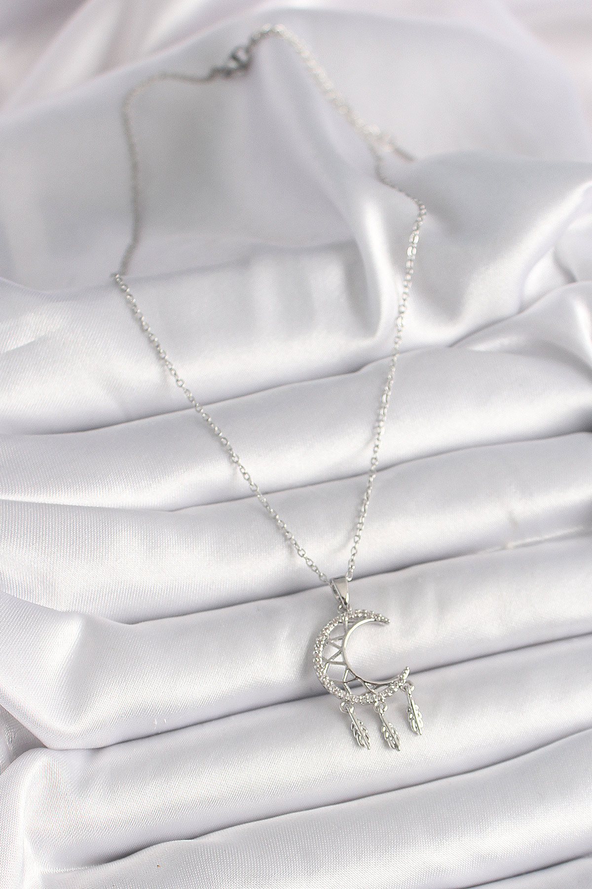 316L Çelik Gümüş Renk Zincir Zirkon Taşlı Hilal Model Sallantı Yaprak Detay Kadın Kolye