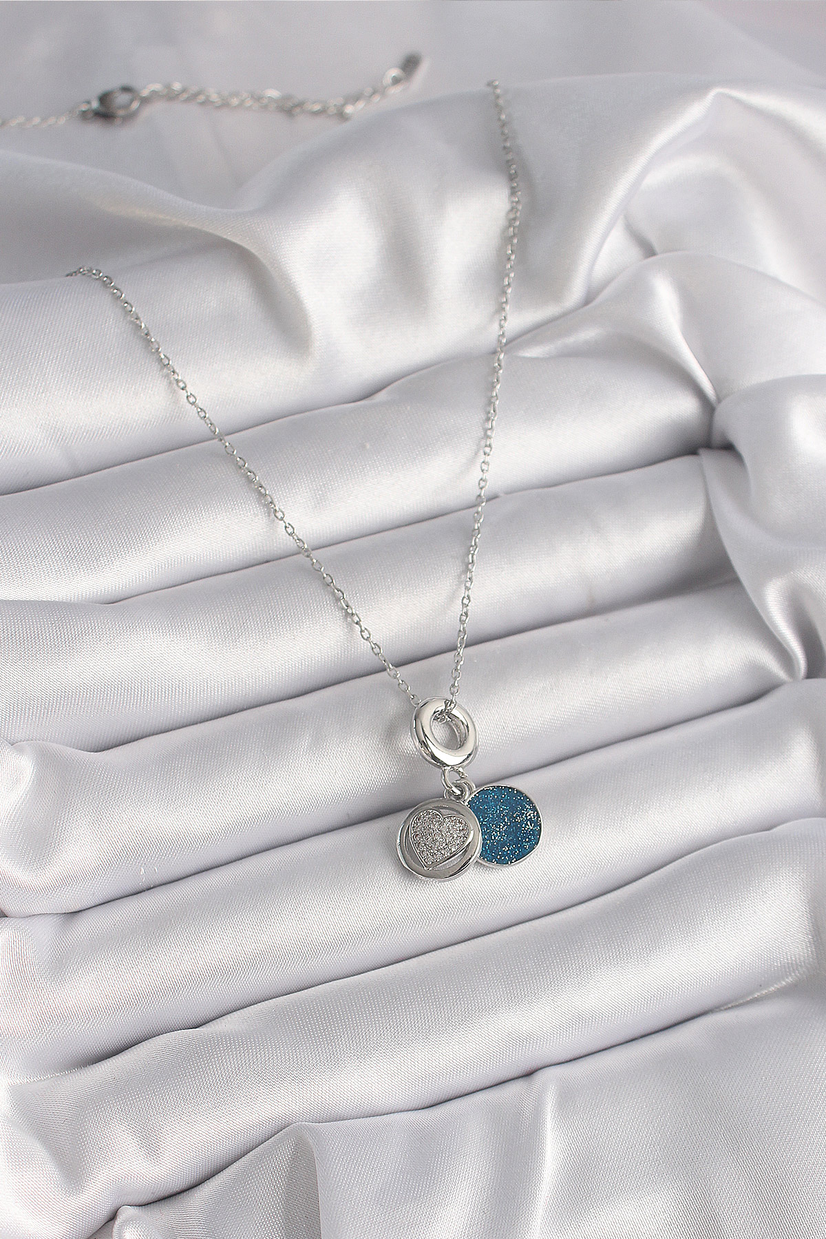 316L Çelik Gümüş Renk Zincir Zirkon Taşlı İşleme Mavi Simli Kadın Kolye