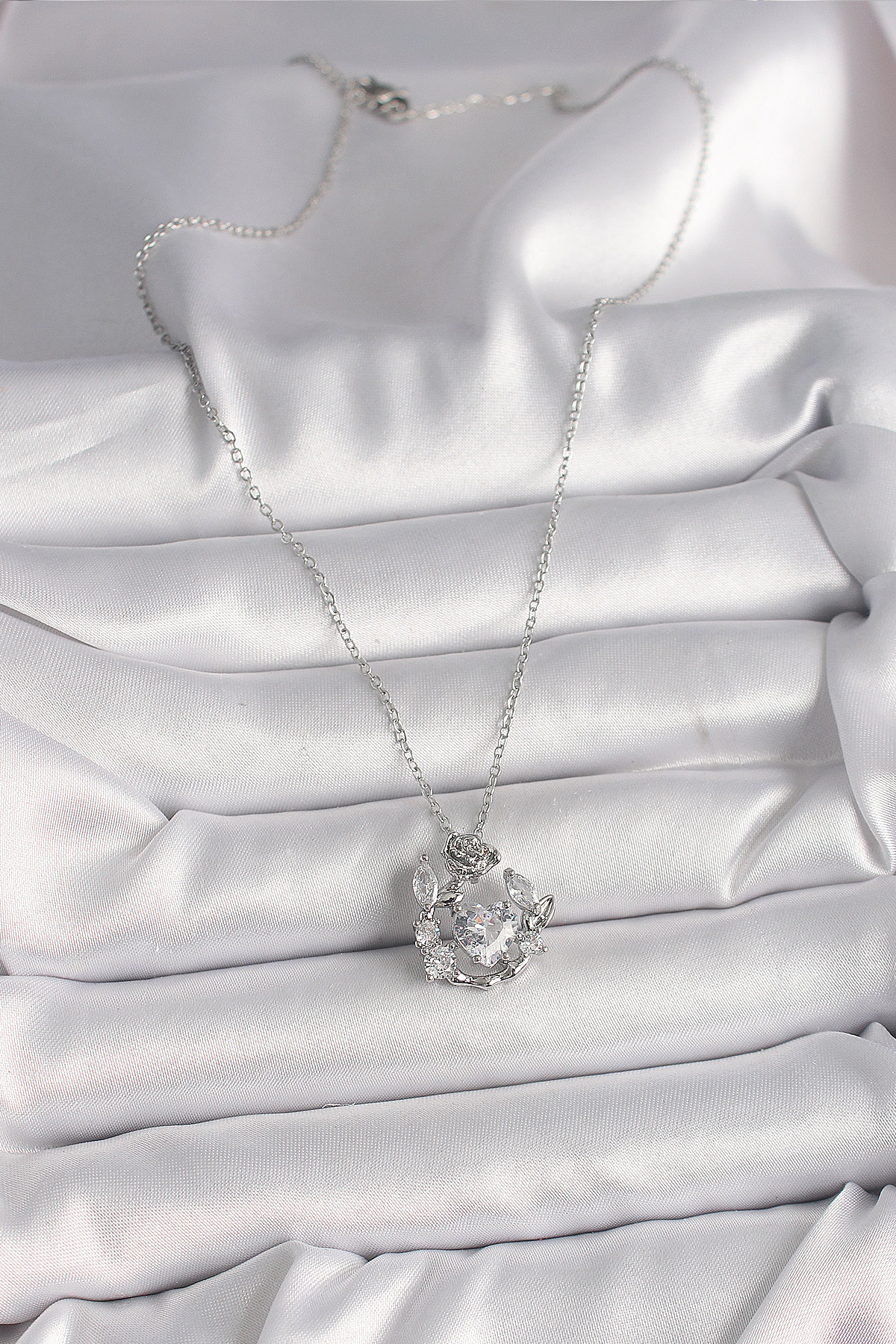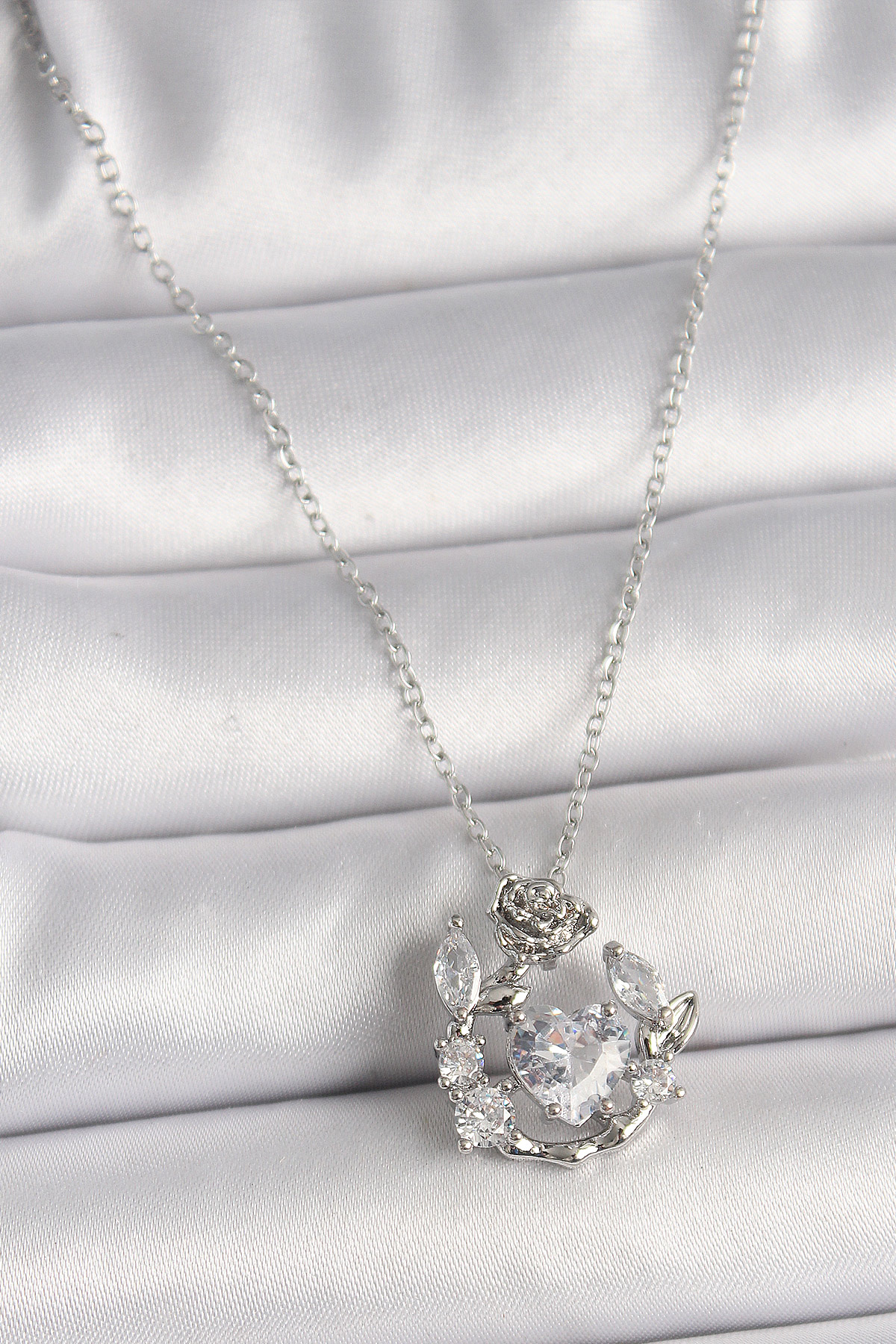 316L Çelik Gümüş Renk Zincir Zirkon Taşlı Kalp Figür Gül Detay Kadın Kolye