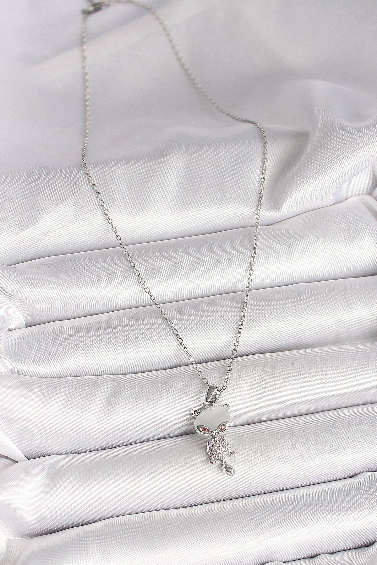 316L Çelik Gümüş Renk Zincir Zirkon Taşlı Kedi Model Kadın Kolye