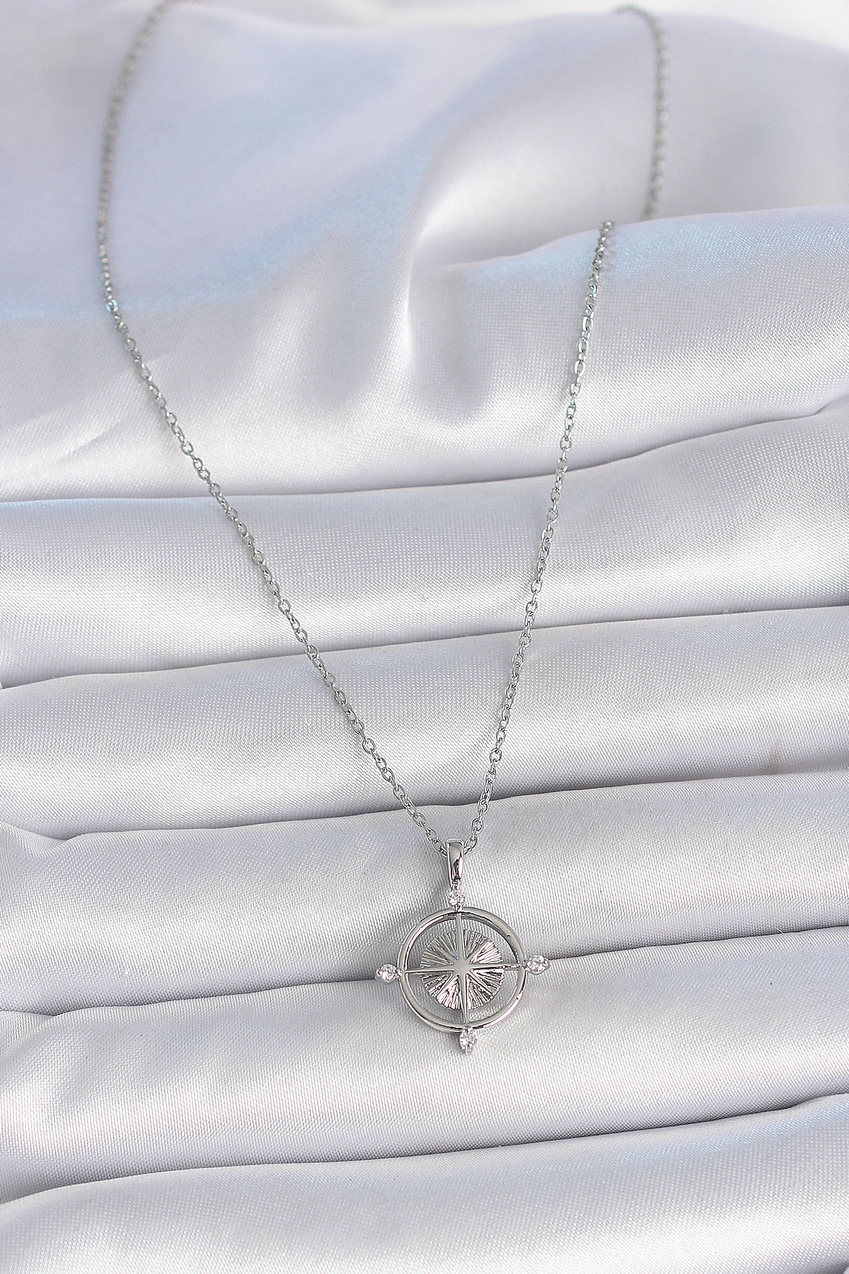 316L Çelik Gümüş Renk Zincir Zirkon Taşlı Pusula Model Kadın Kolye