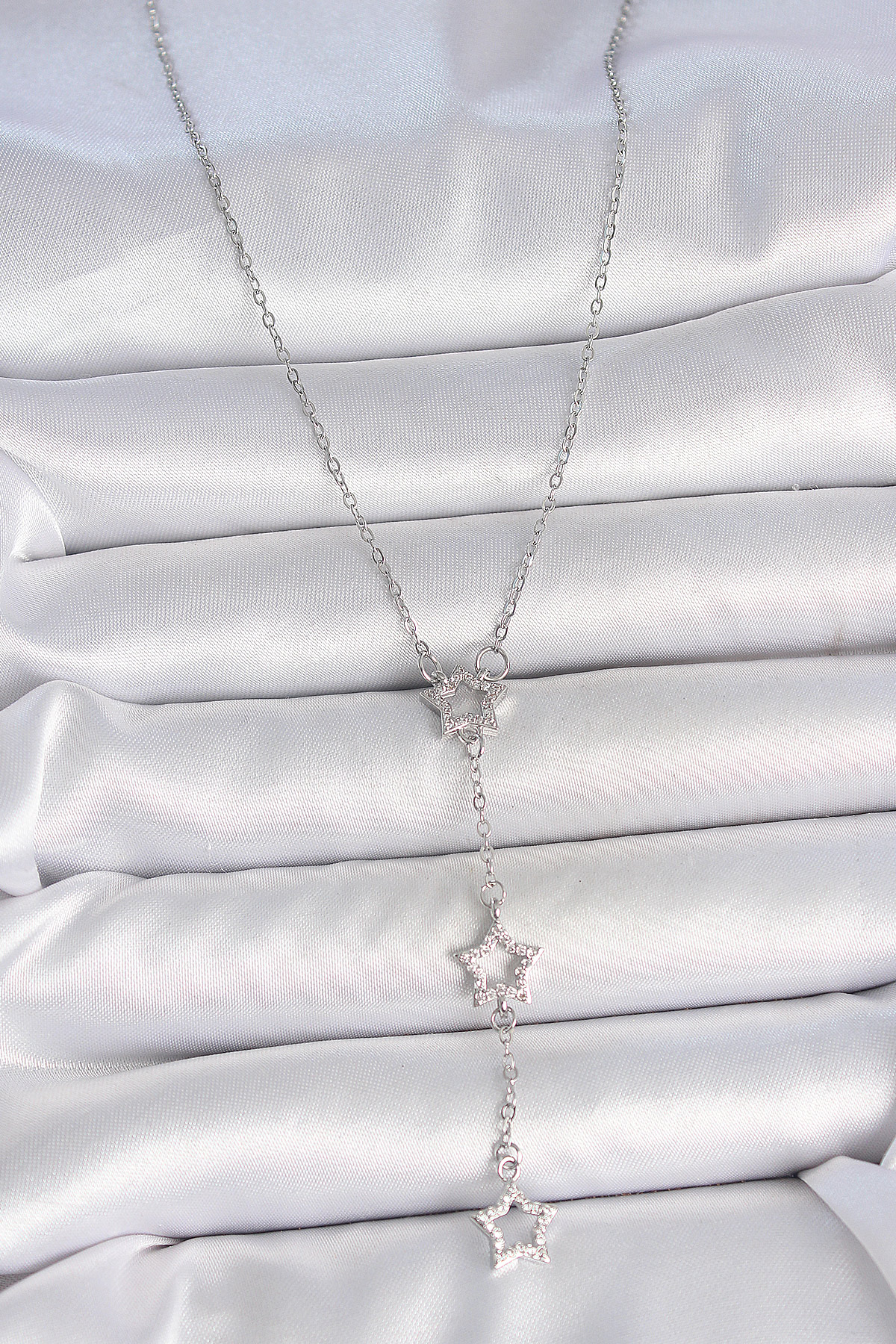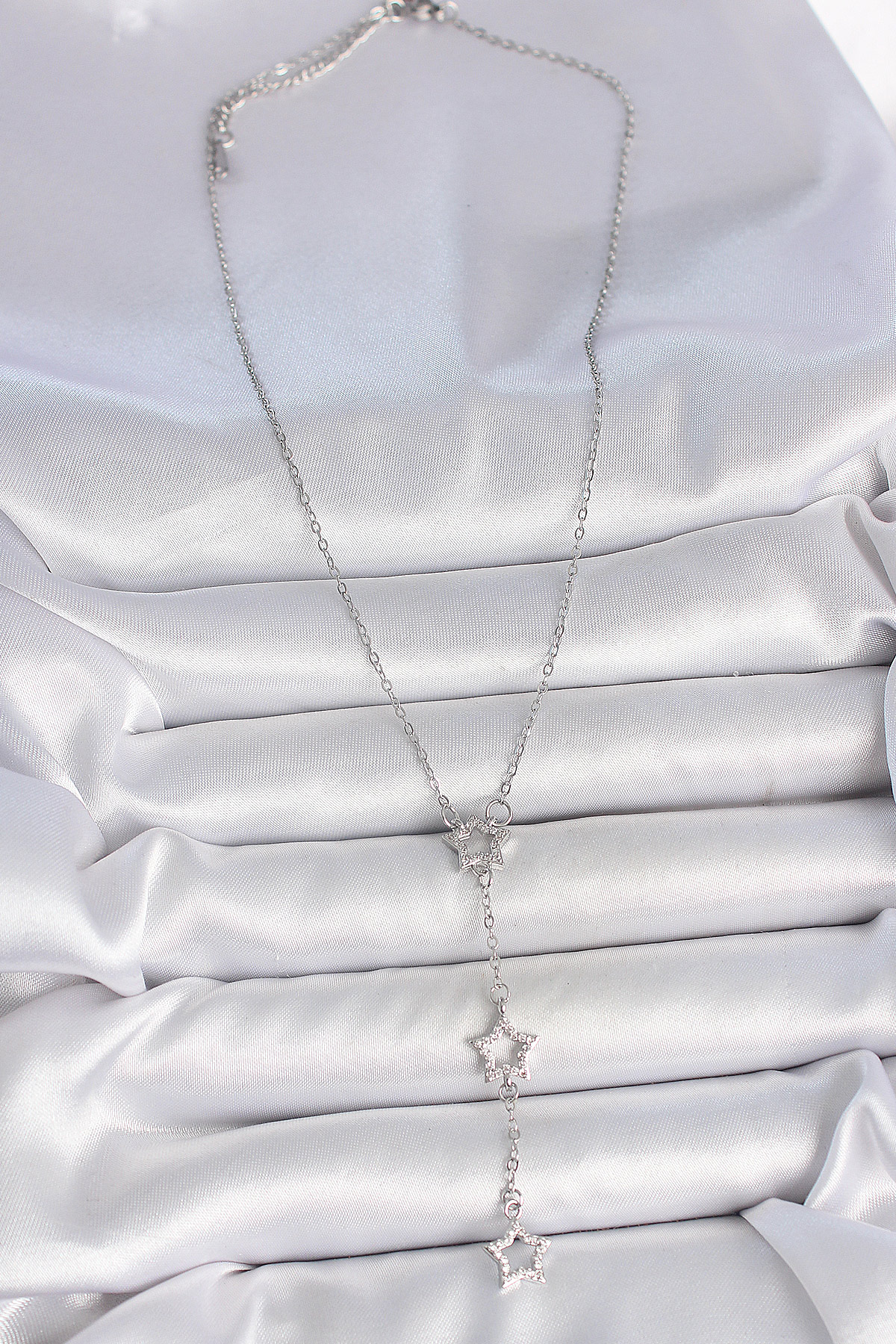316L Çelik Gümüş Renk Zincir Zirkon Taşlı Yıldız Y Model Kadın Kolye