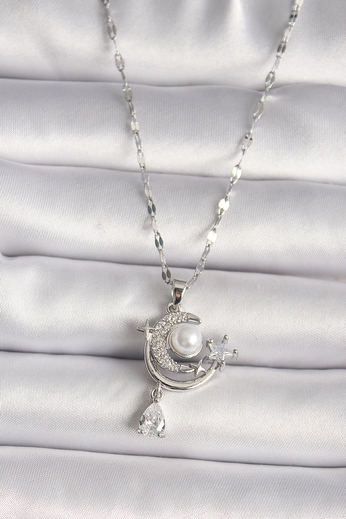 316L Çelik Gümüş Renk Zirkon Taşlı Ay Yıldız Sallantı Detay Kadın Kolye