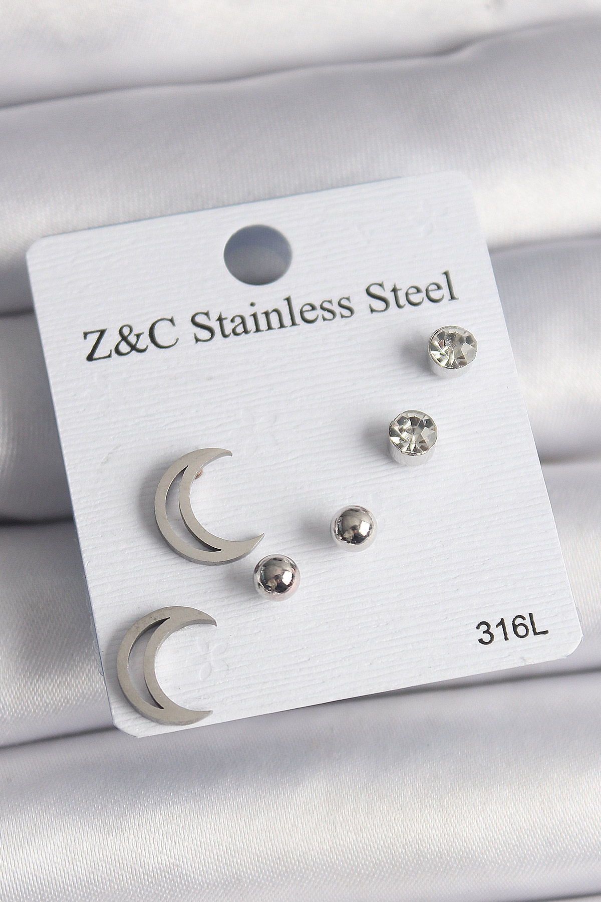 316L Çelik Gümüş Renk Zirkon Taşlı Hilal Model Kadın Küpe Seti