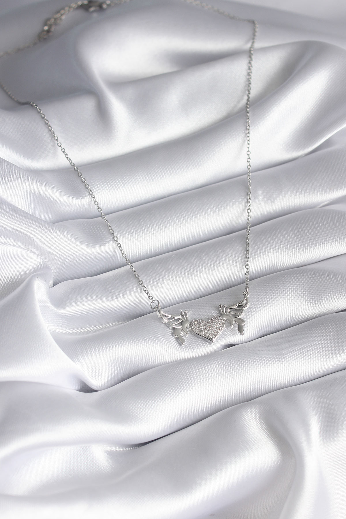 316L Çelik Gümüş Renk Zirkon Taşlı Kanat Kalp Model Kadın Kolye