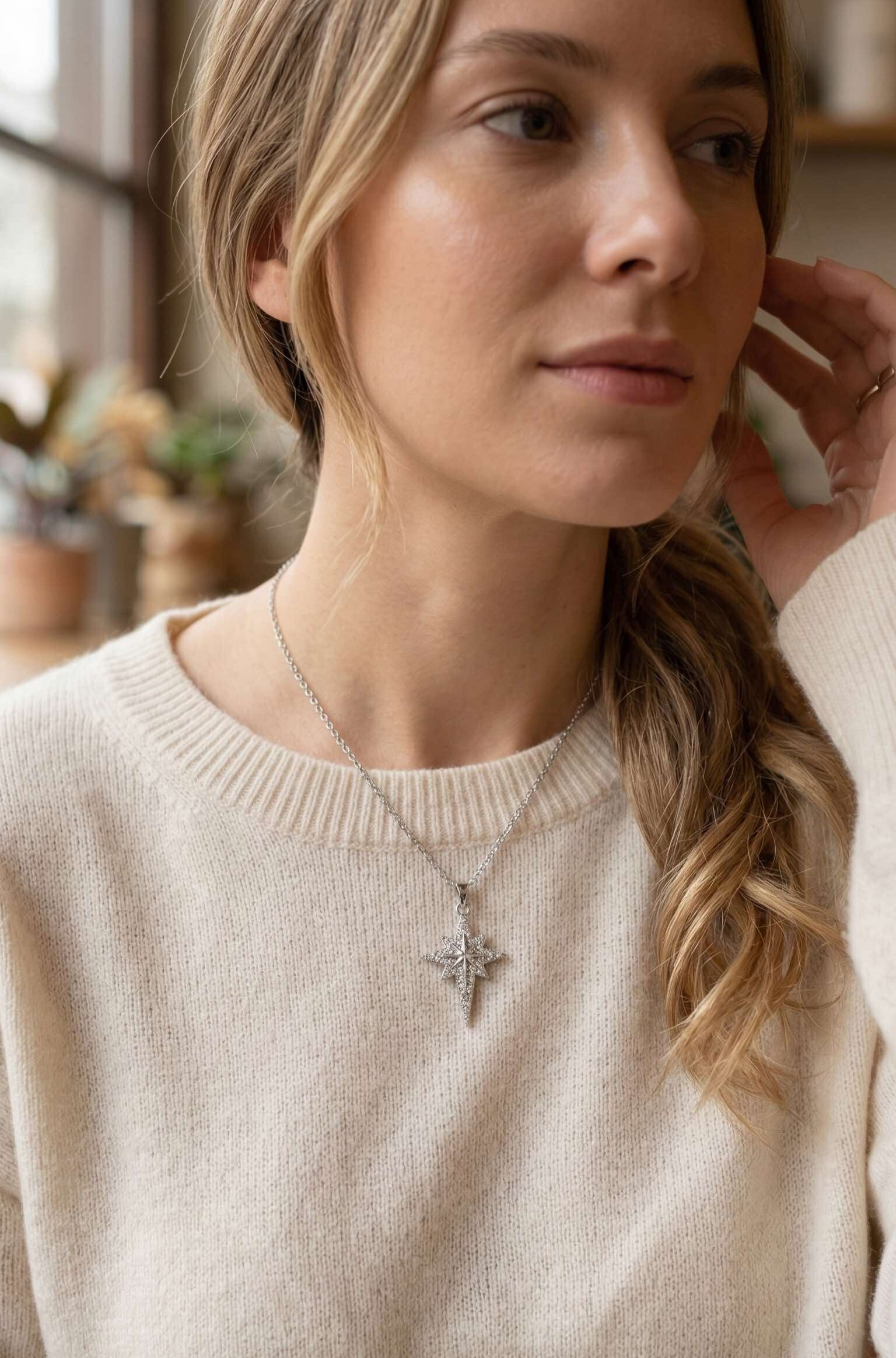 316L Çelik Gümüş Renk Zirkon Taşlı Kutup Yıldızı Model Kolye
