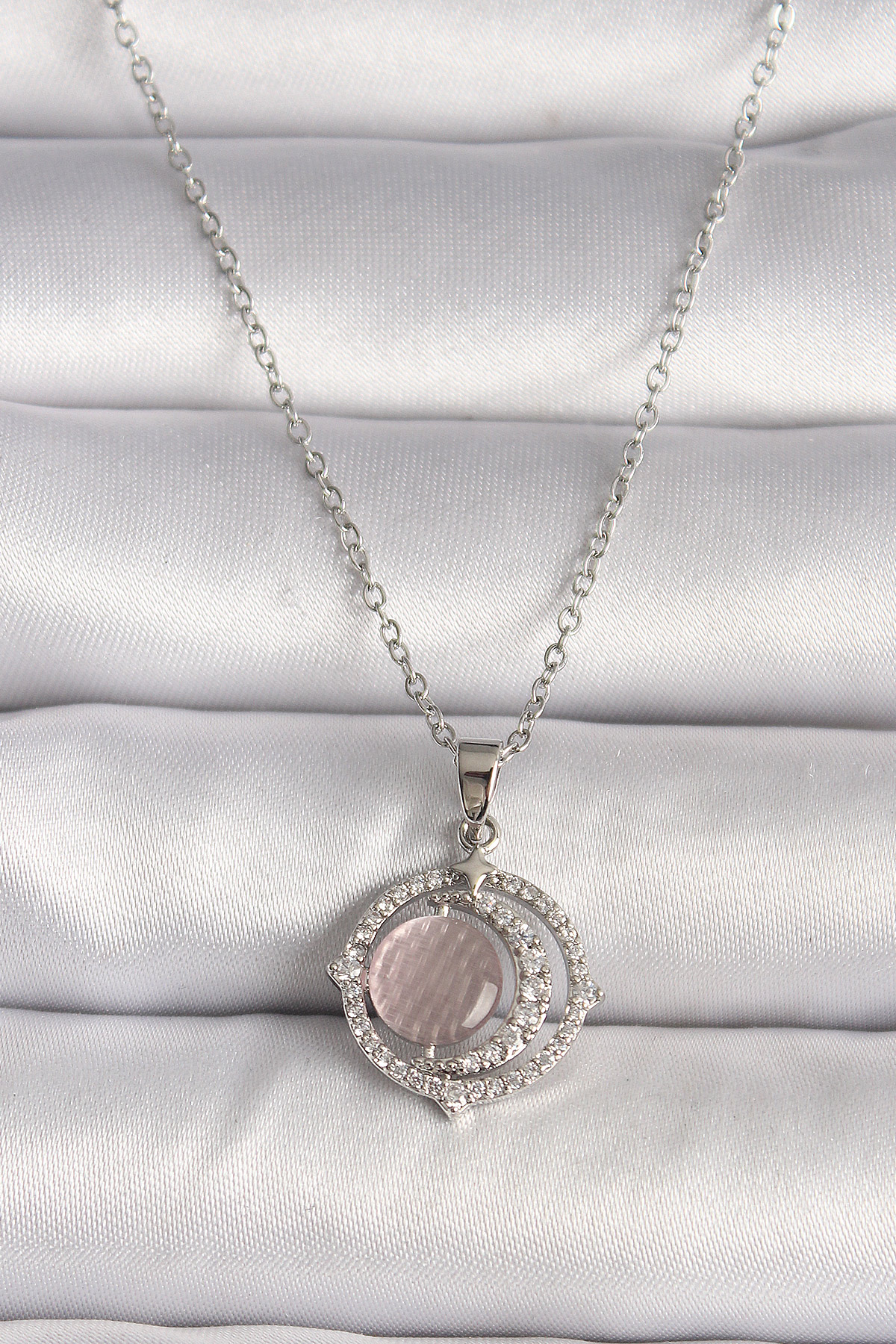 316L Çelik Gümüş Renk Zirkon Taşlı Pembe Sedefli Hilal Model Kadın Kolye