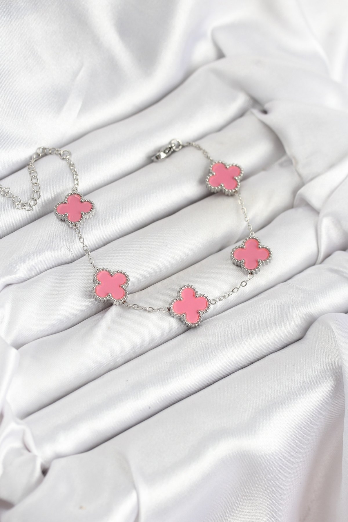 316L Çelik Gümüş Zincir Pembe Renk Yonca Bileklik