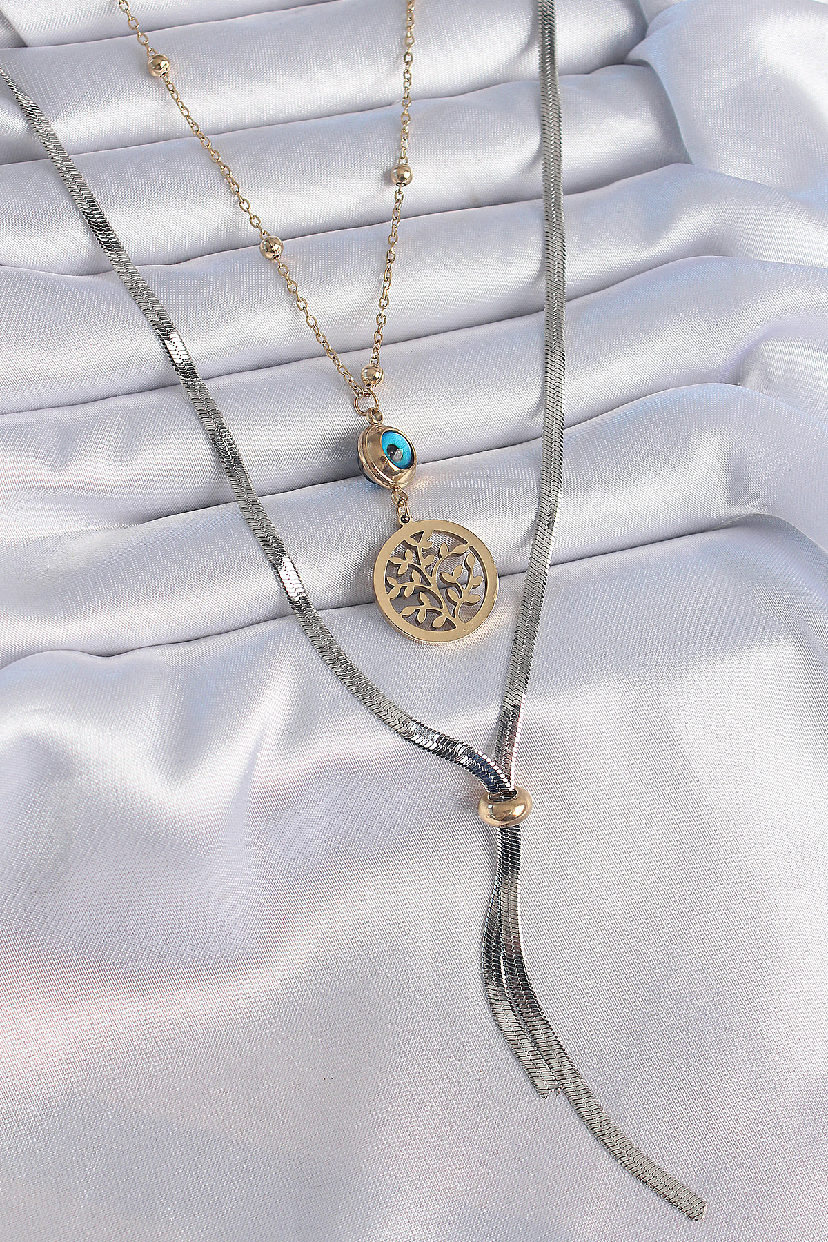 316L Çelik Mix Renk Filiz Figür Nazar Boncuk Detay Uzun Kadın Kolye