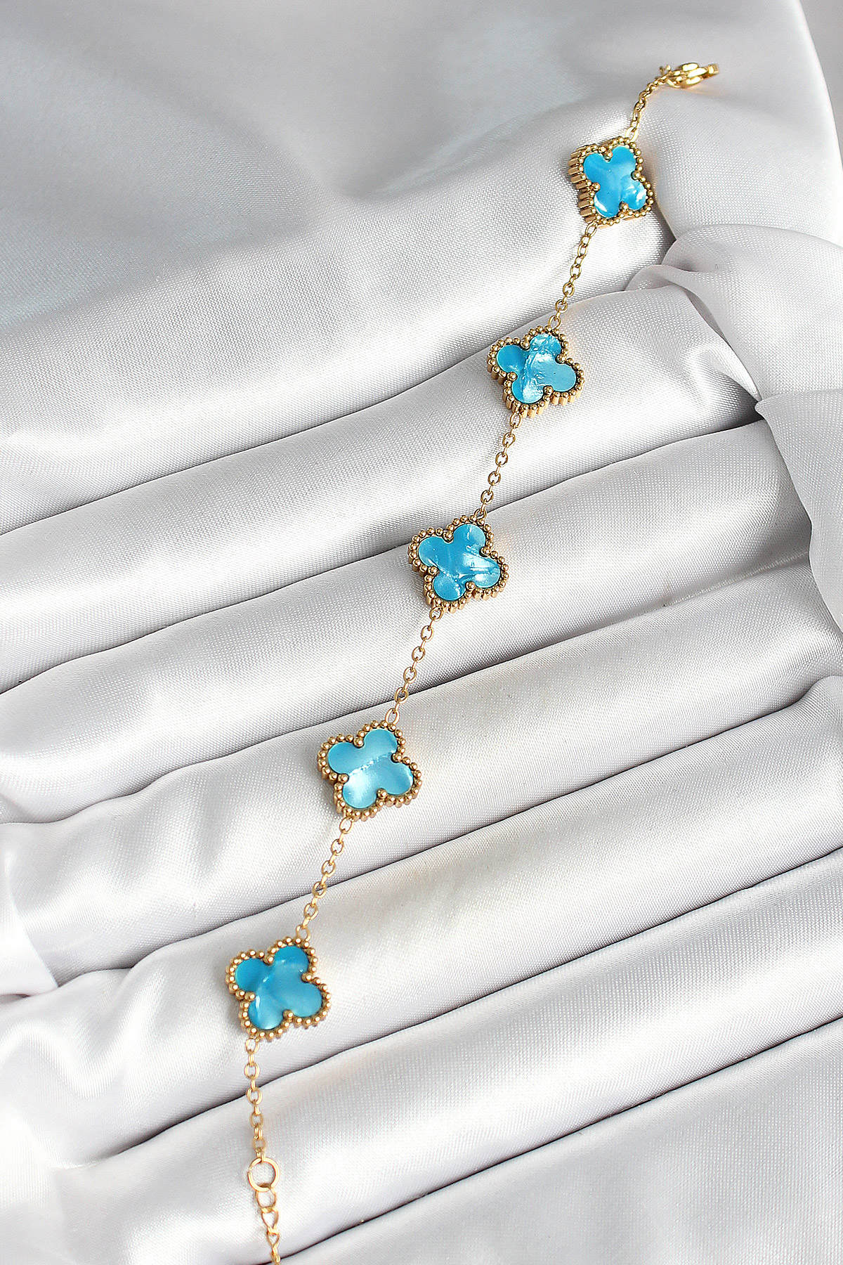 316L Çelik Sedefli Gökyüzü Mavisi Gold Renk Yonca Kadın Bileklik