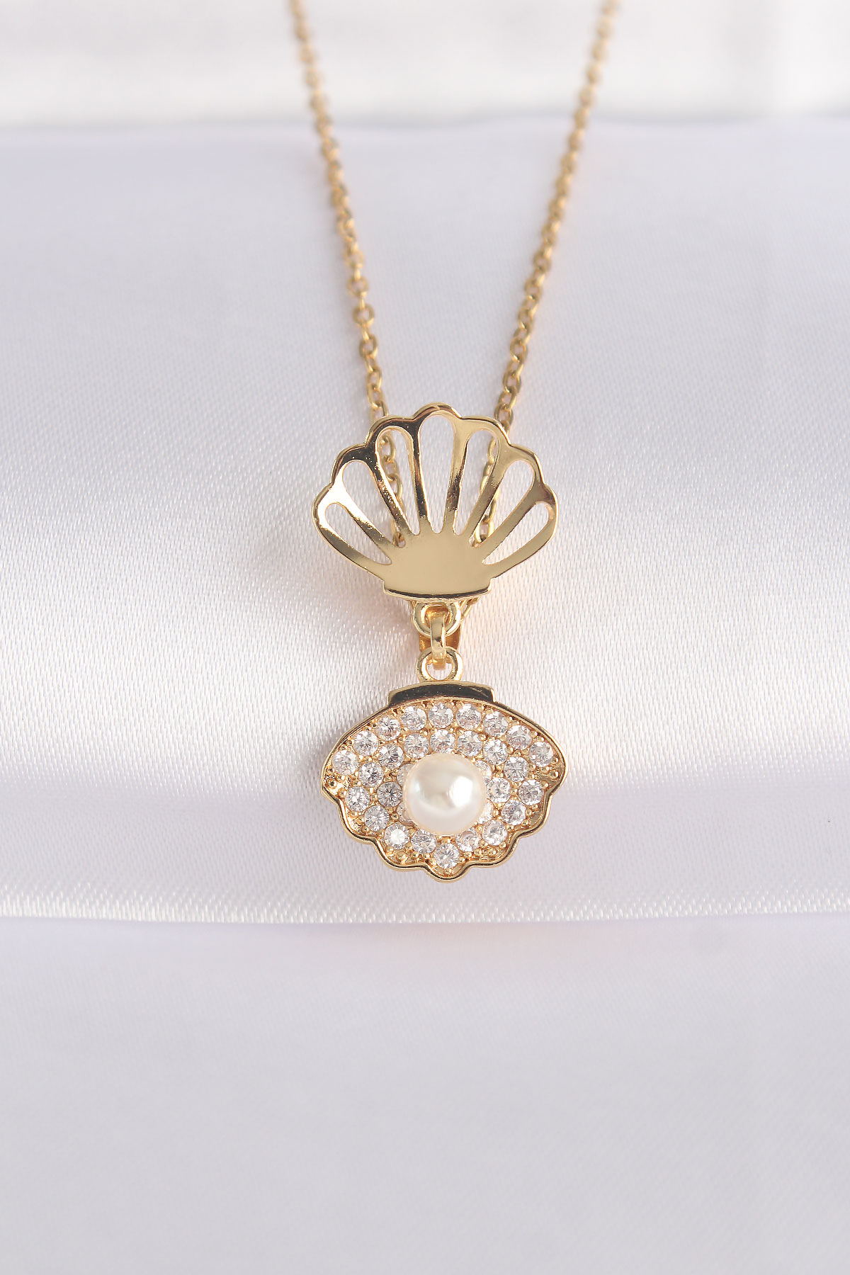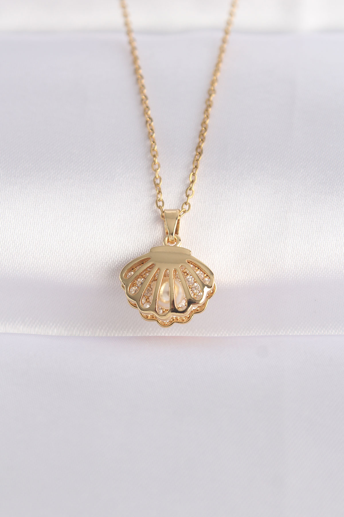 316L Çelik Zincir Altın Renk Zirkon Taşlı İnci Detay İstiridye Kolye