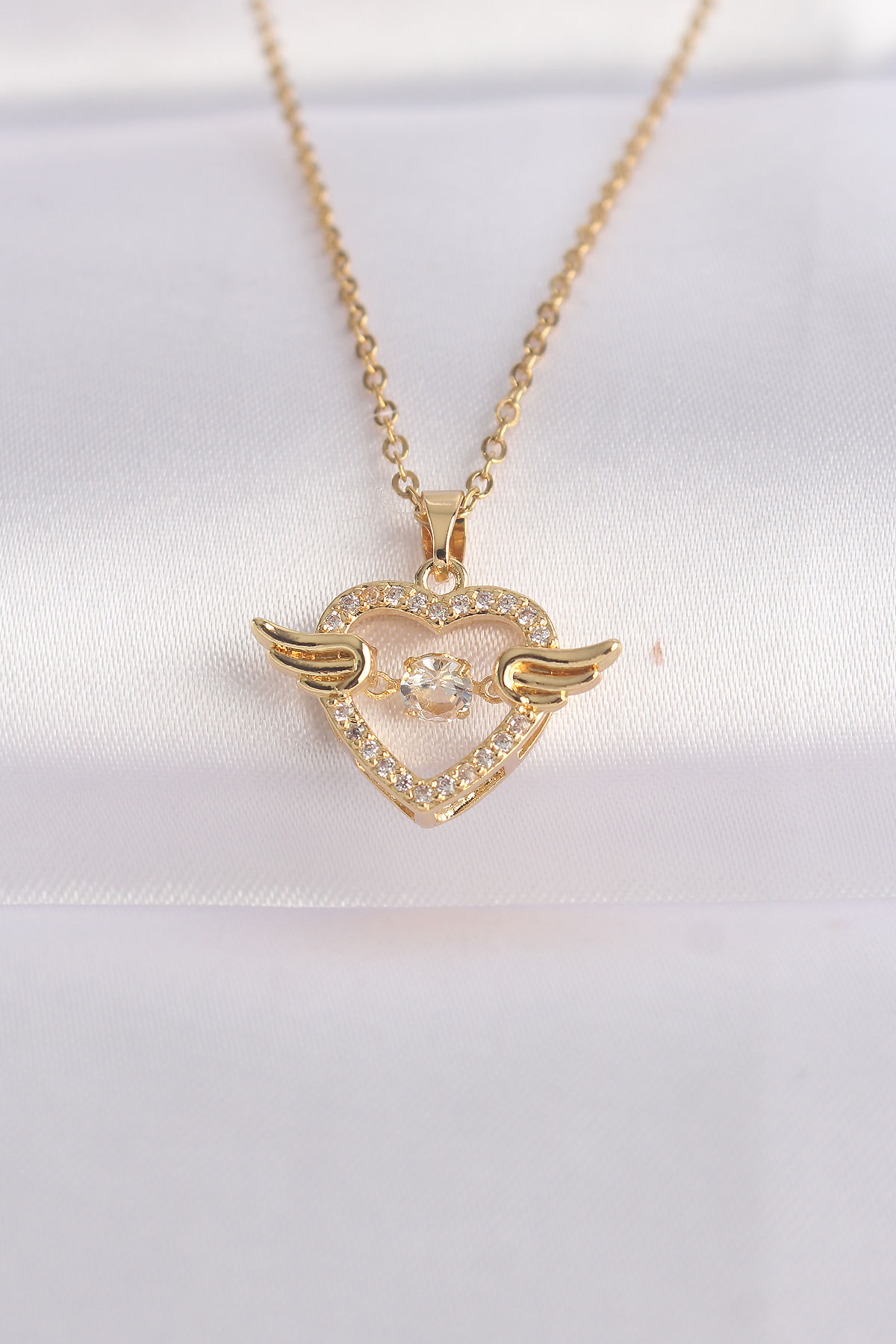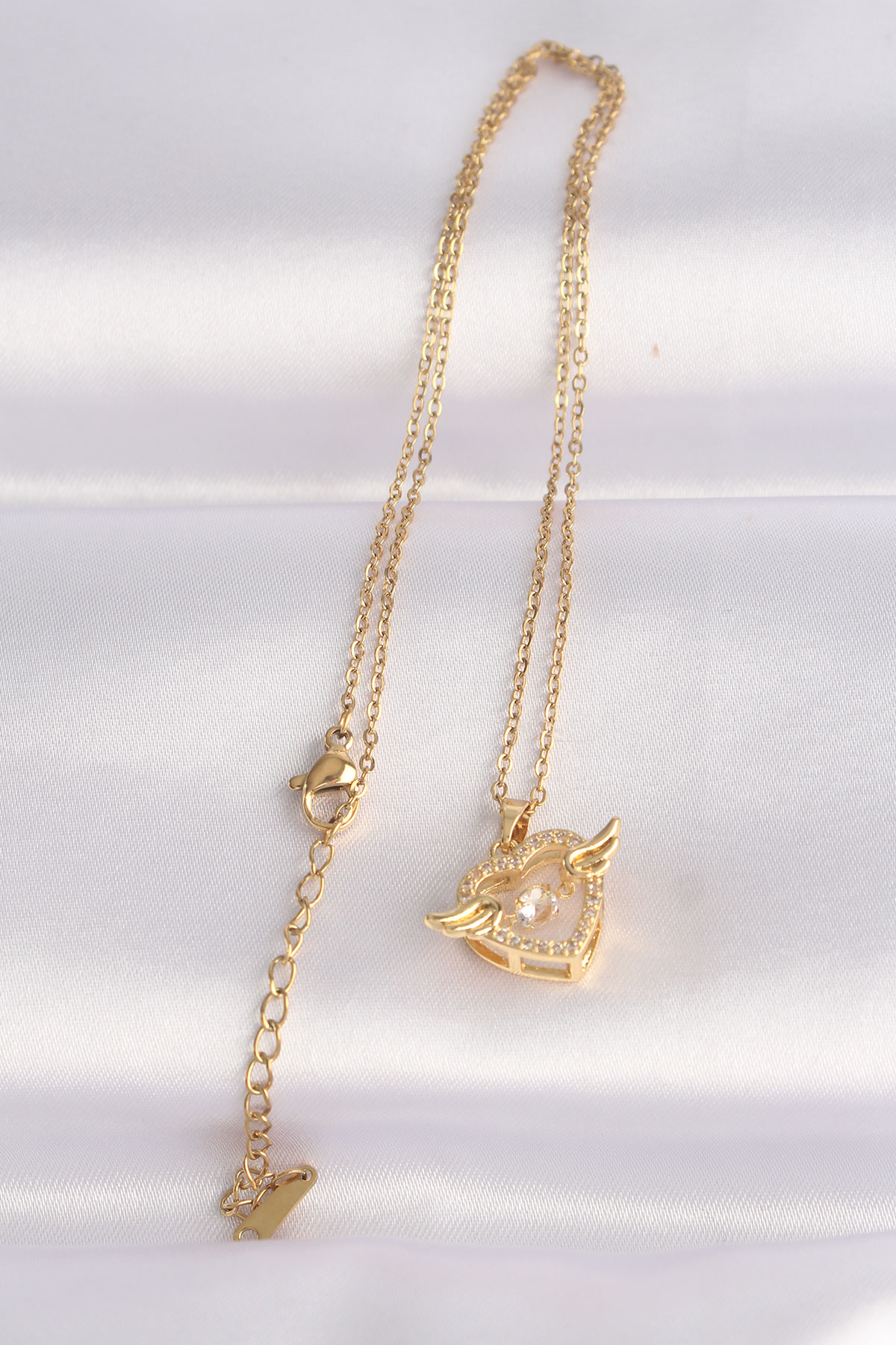 316L Çelik Zincir Altın Renk Zirkon Taşlı Kanatlı Kalp Kolye