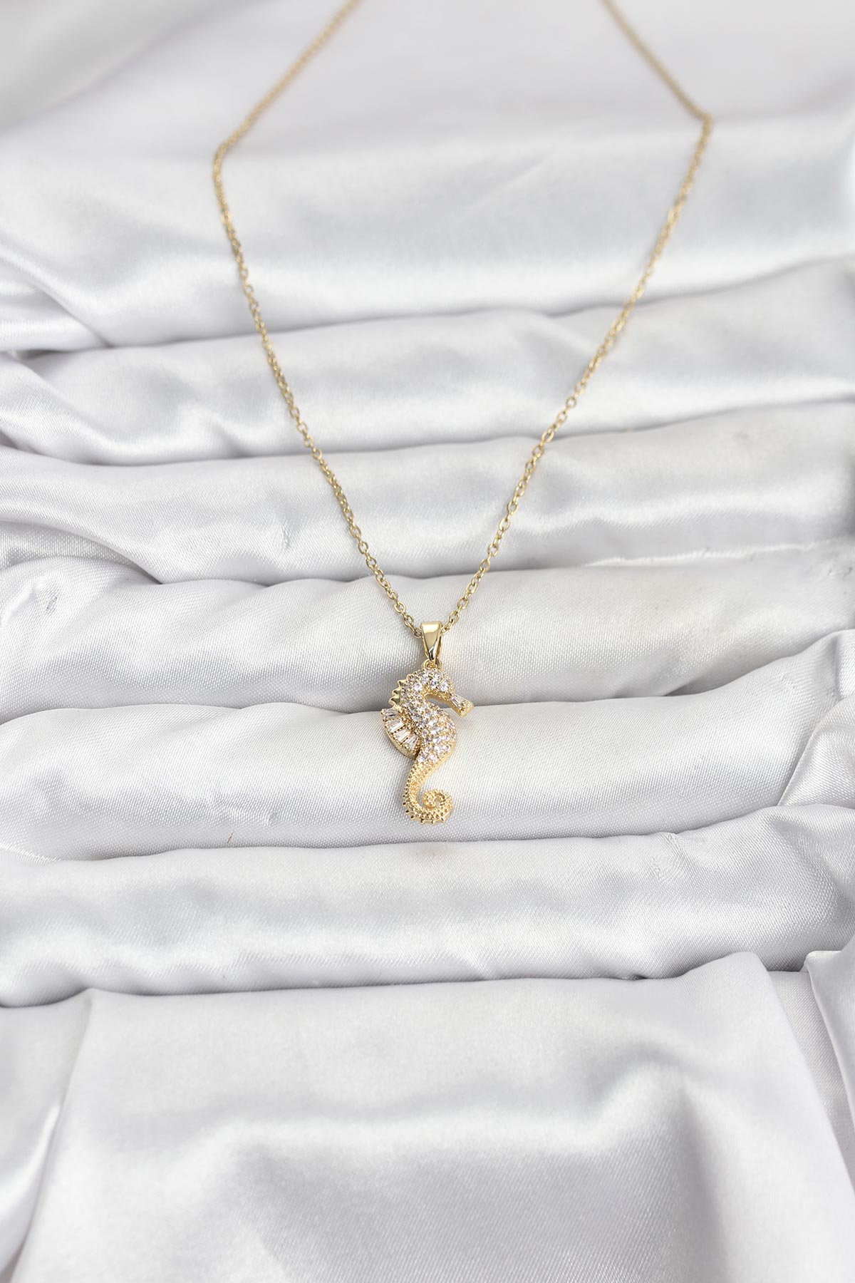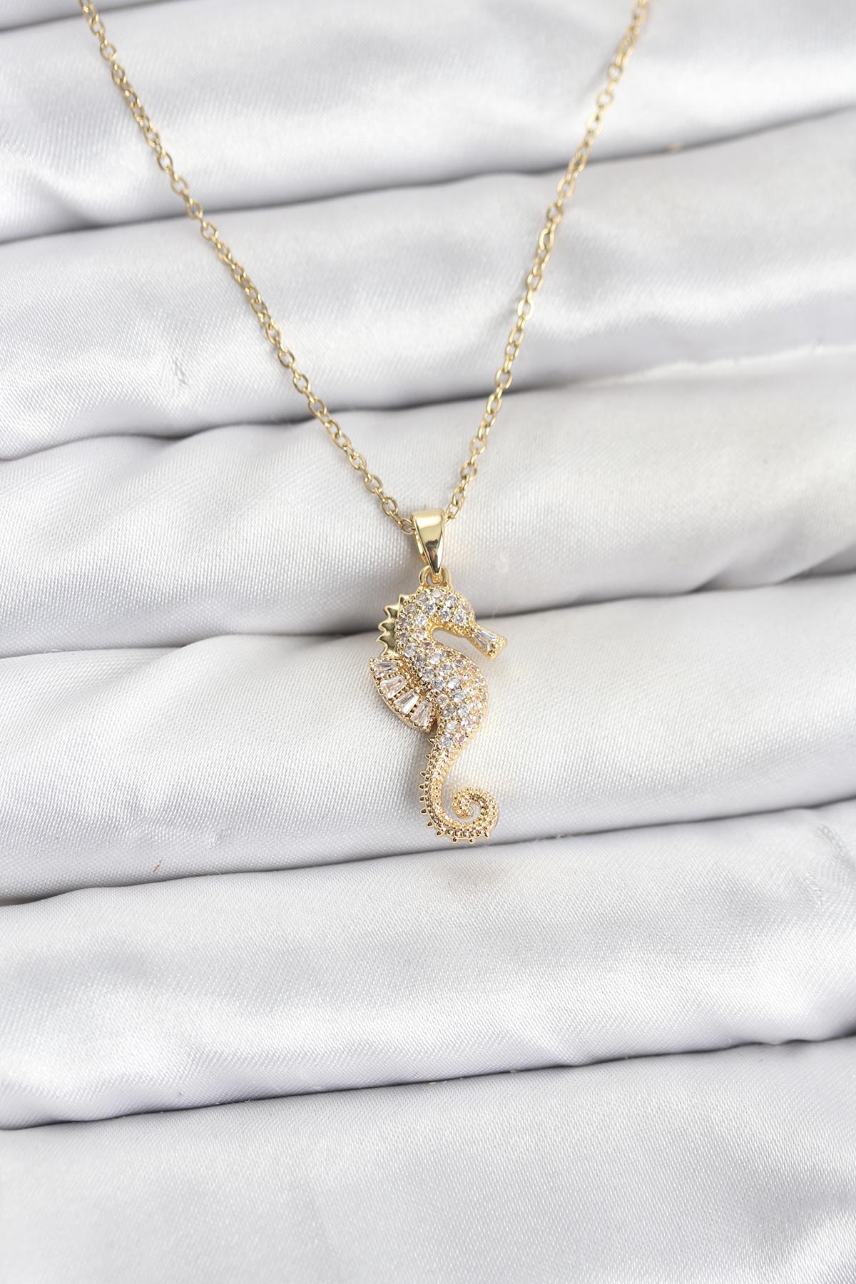 316L Çelik Zincir Gold Renk Deniz Atı Model Zirkon Taşlı Kadın Kolye