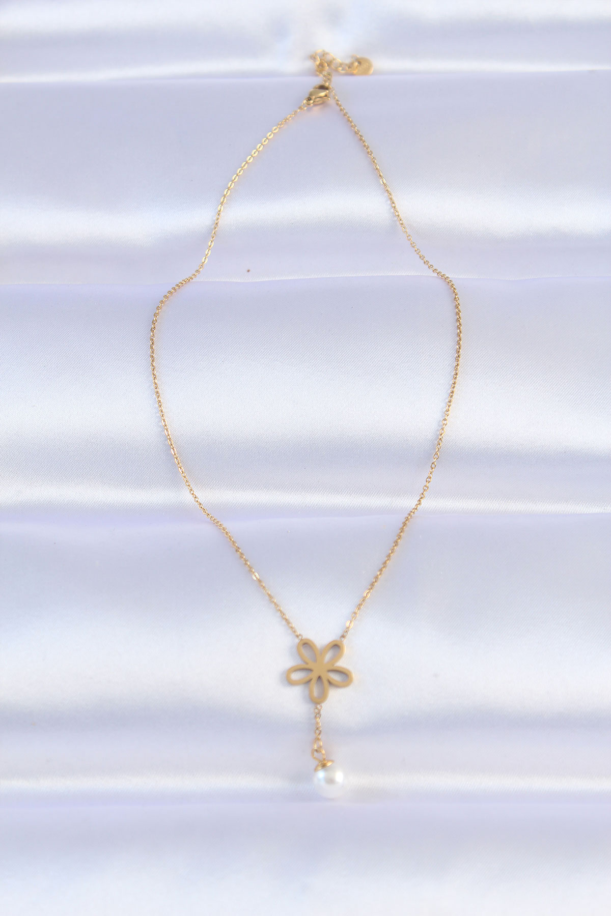 316L Çelik Zincir Gold Renk İnci Detay Çiçek Kolye
