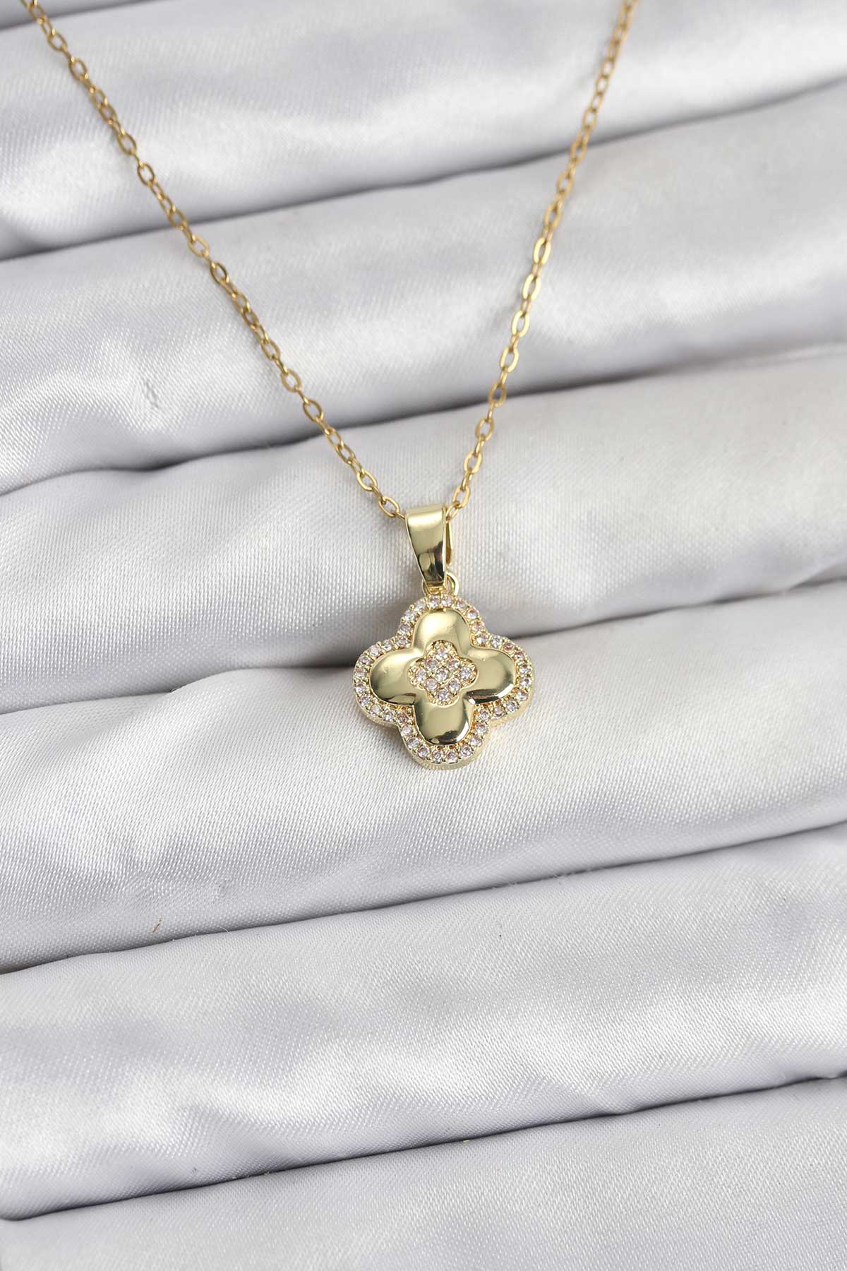 316L Çelik Zincir Gold Renk Zirkon Taşlı Yonca Model Kadın Kolye