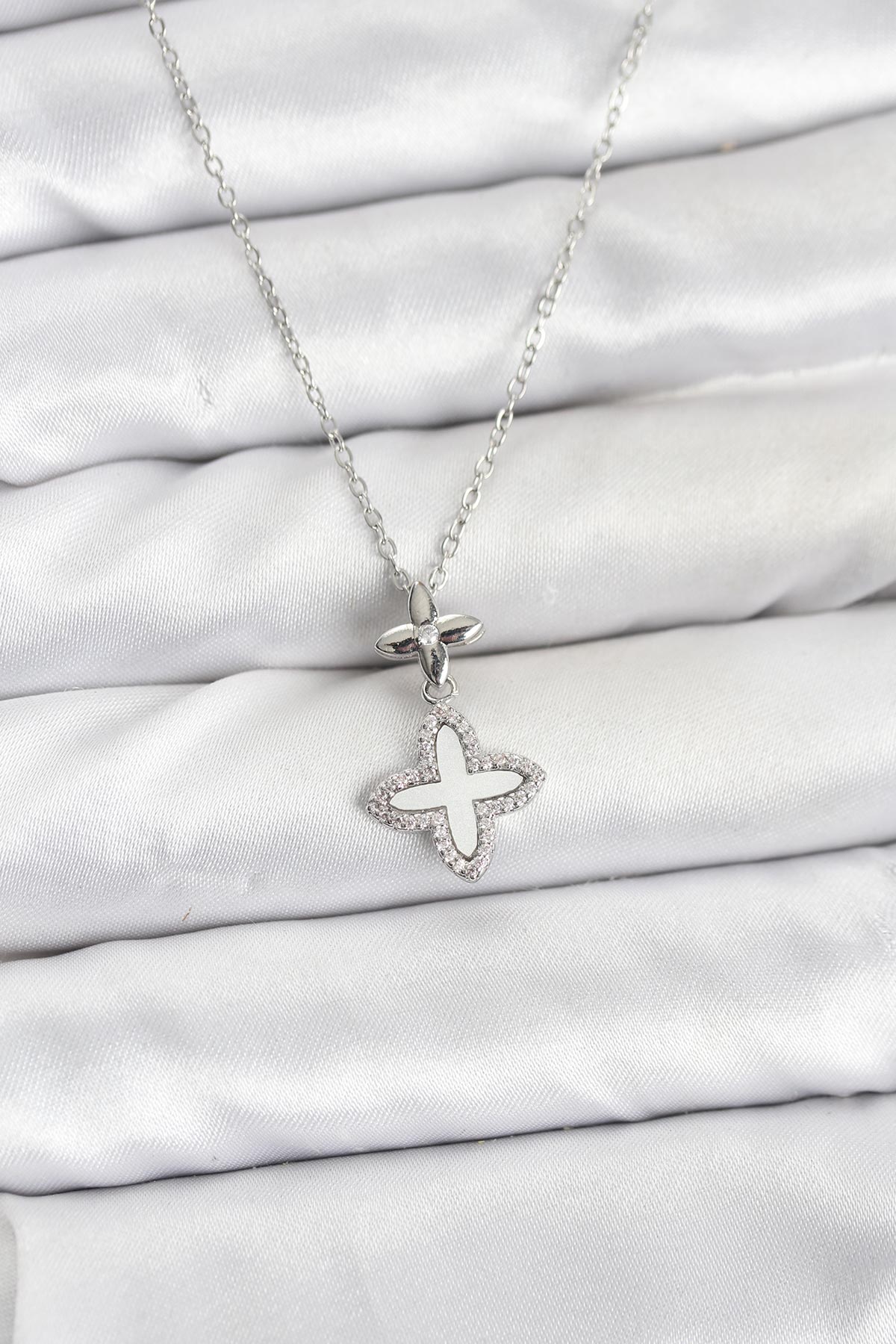 316L Çelik Zincir Gümüş Renk 4 Yapraklı Yonca Model Zirkon Taşlı Kadın Kolye