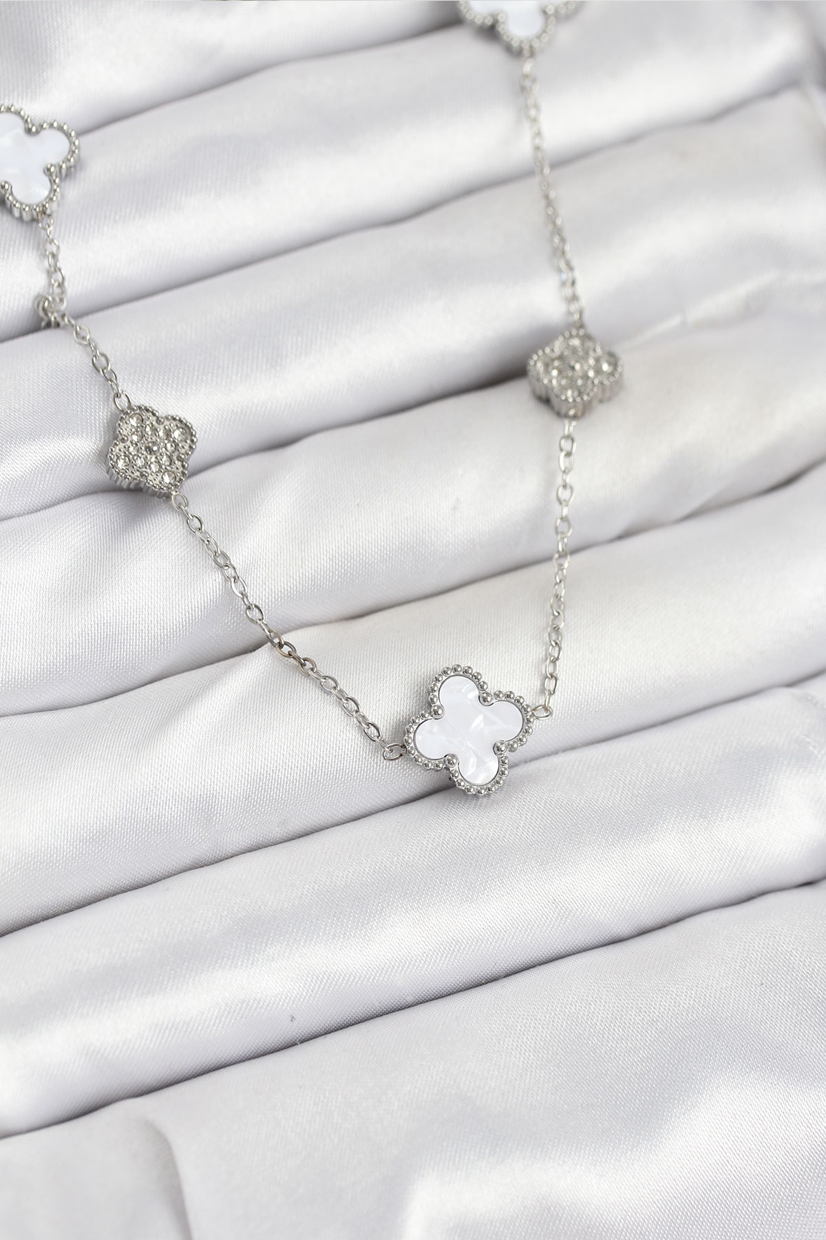 316L Çelik Zincir Gümüş Renk Beyaz ve Zirkon Taşlı Yonca Kadın Kolye