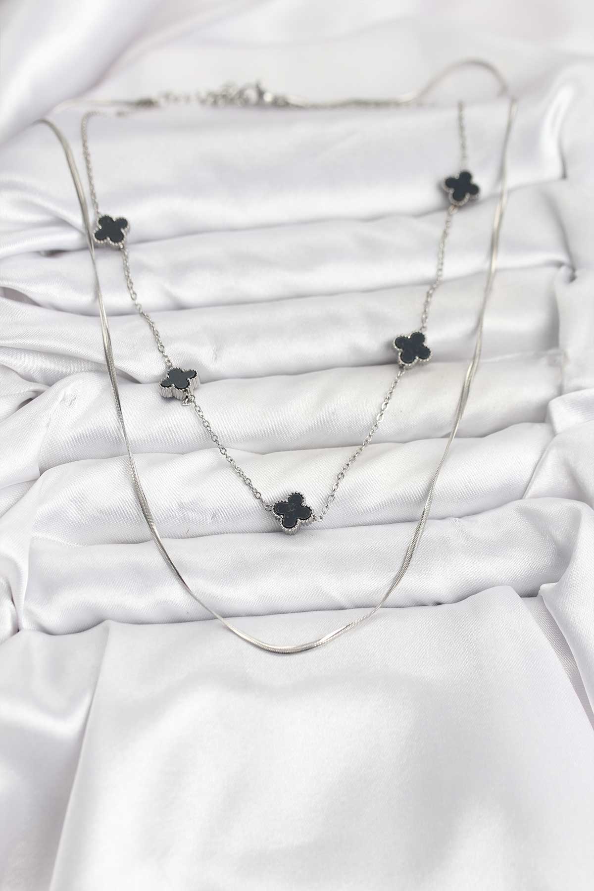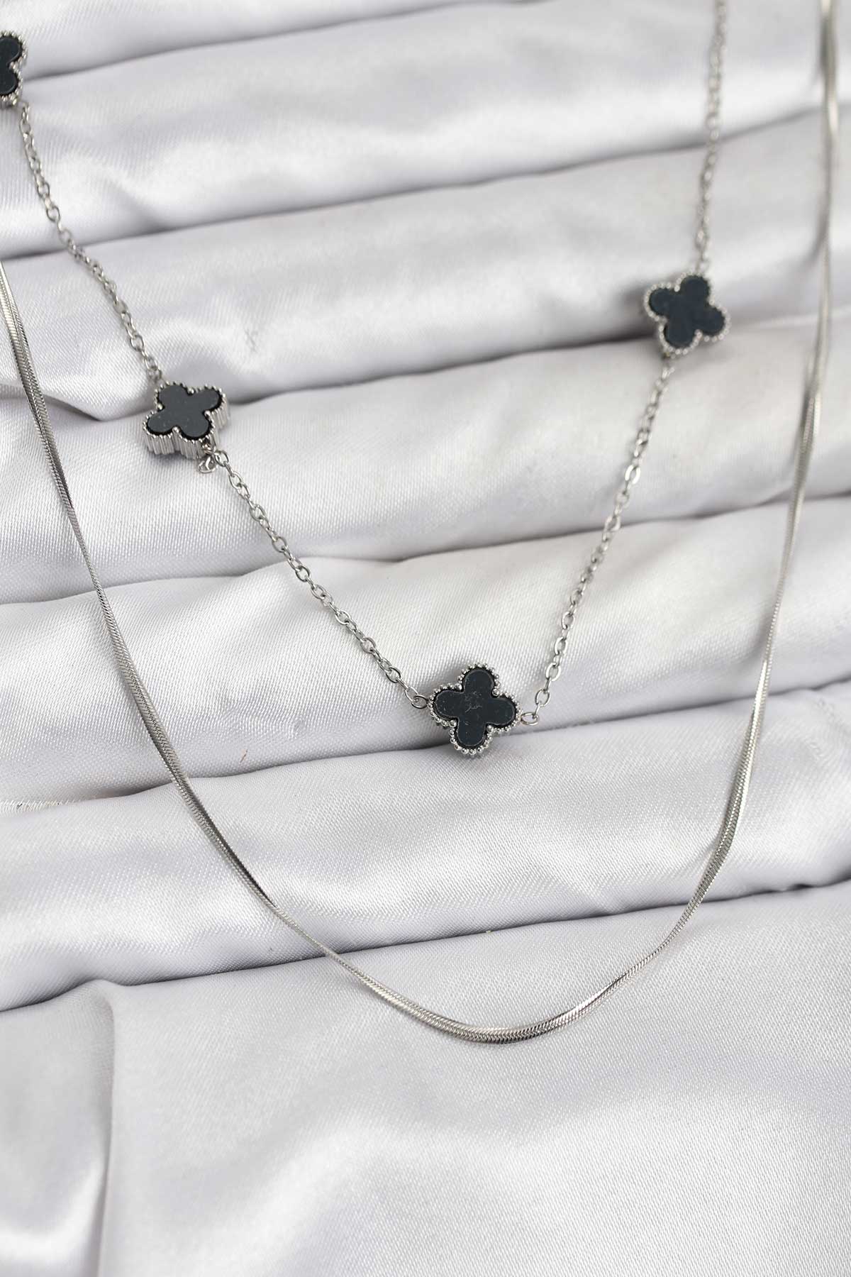 316L Çelik Zincir Gümüş Renk İtalyan Zincirli Siyah Yonca Model Kadın Kolye