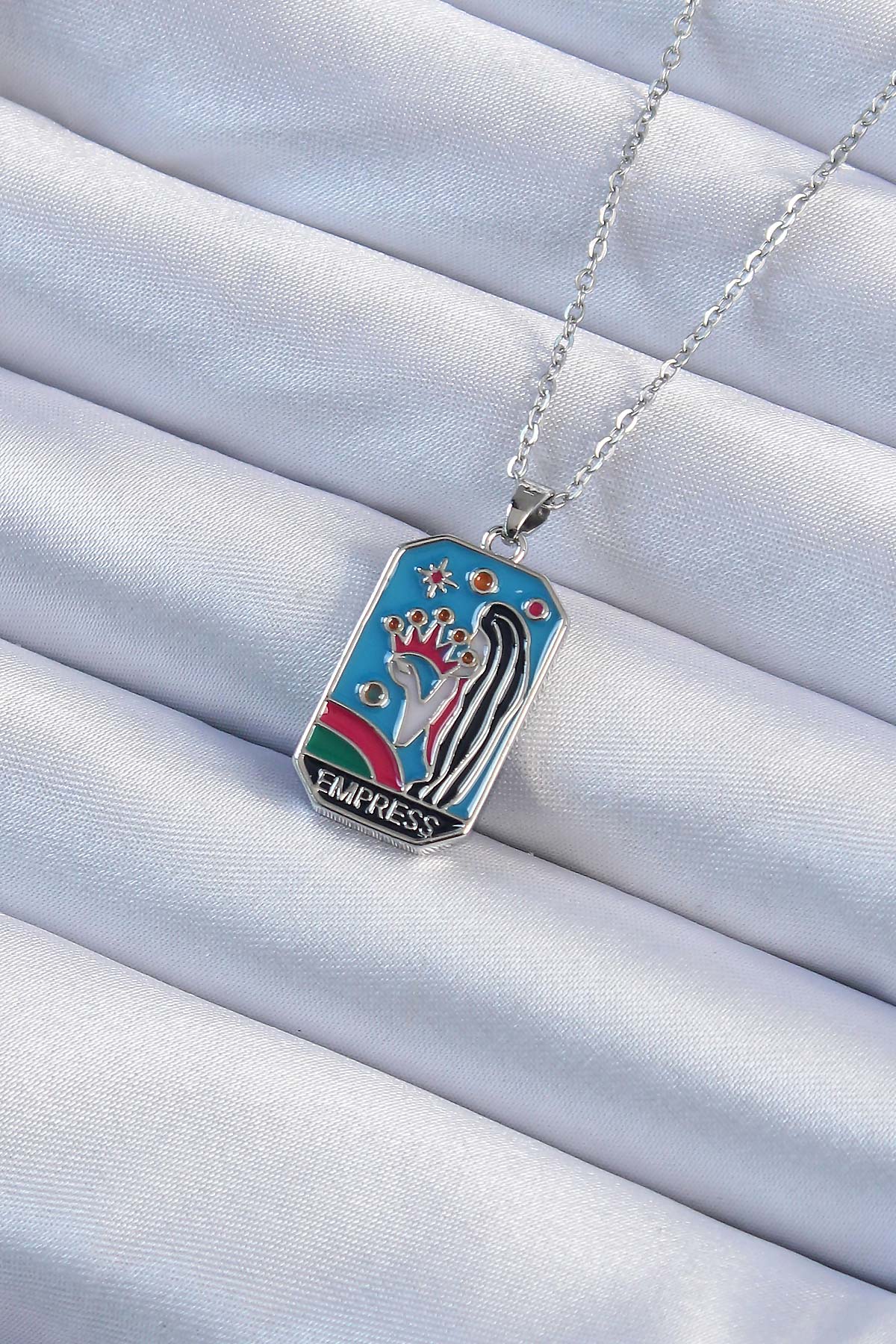316L Çelik Zincir Gümüş Renk Taç ve Kız Figürlü Renkli Mineli Tarot Kolye