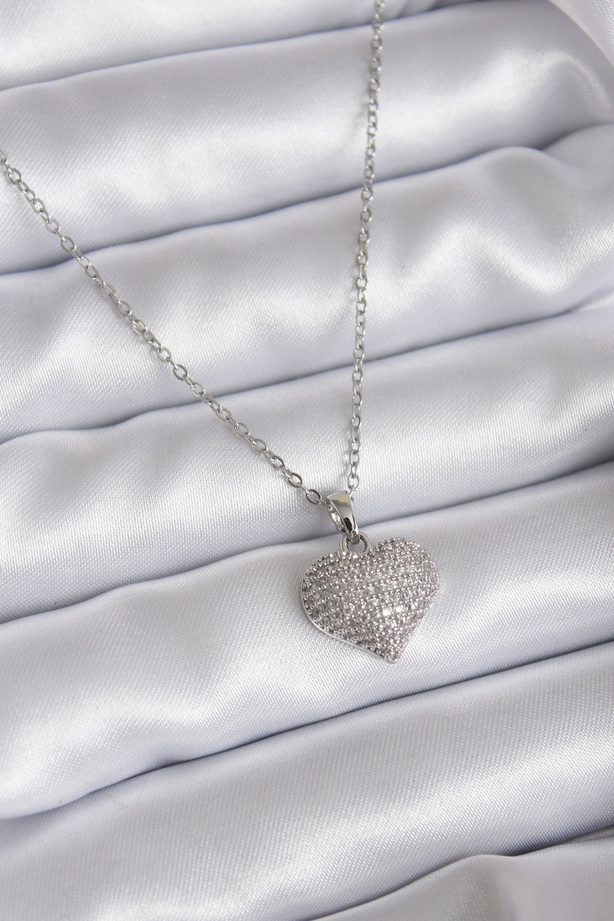 316L Çelik Zincir Gümüş Renk Zirkon Taş Detay Kalp Model Kadın Kolye