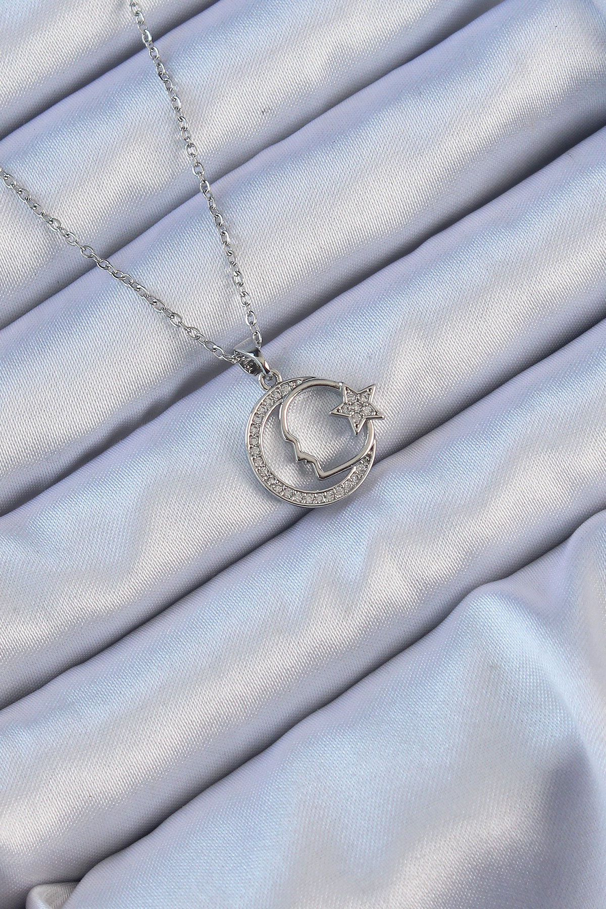 316L Çelik Zincir Gümüş Renk Zirkon Taşlı Ay Yıldız Simgeli Atatürk Kolye