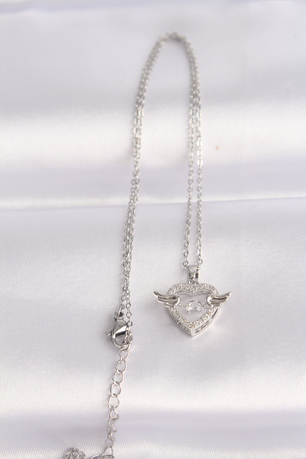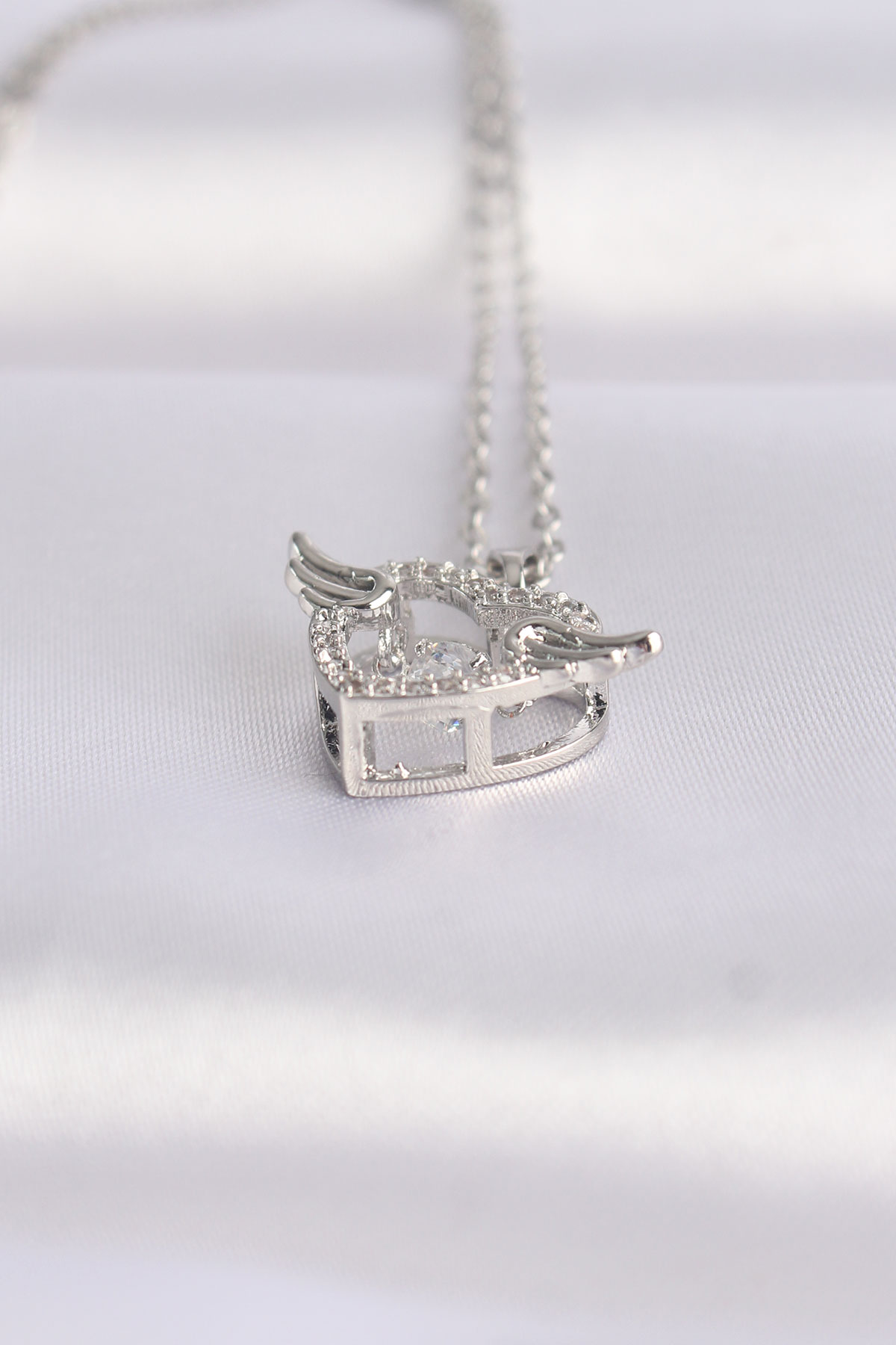 316L Çelik Zincir Gümüş Renk Zirkon Taşlı Kanatlı Kalp Kolye