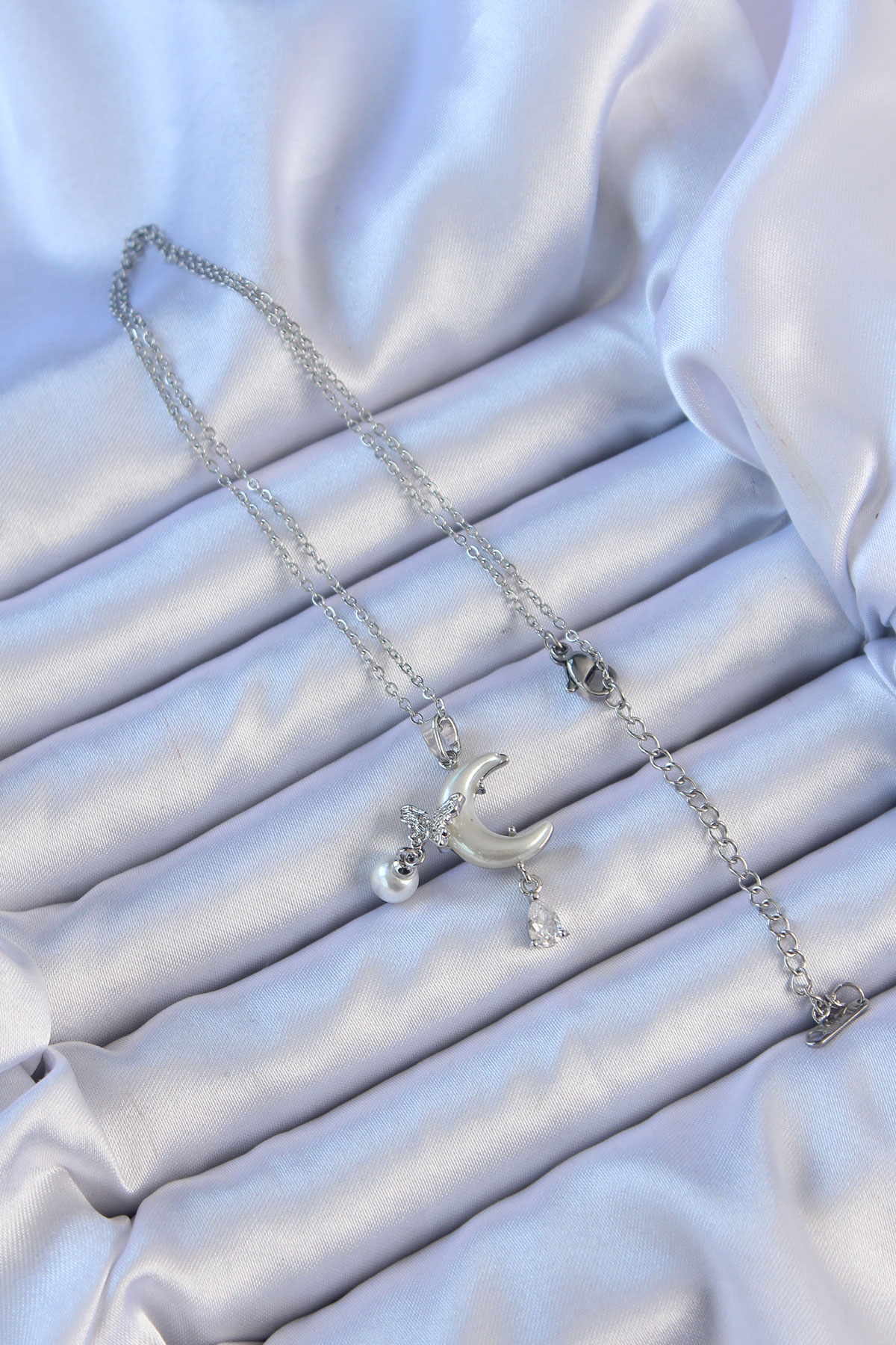 316L Çelik Zincir Gümüş Renk Zirkon Taşlı Kelebekli Mineli Ay Kolye