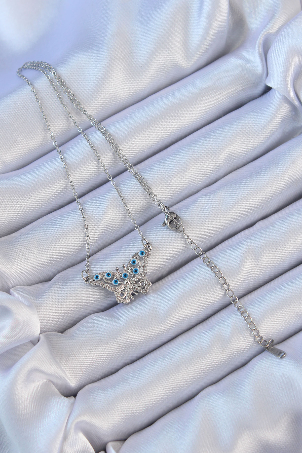 316L Çelik Zincir Gümüş Renk Zirkon Taşlı Nazarlı Kelebek Kolye