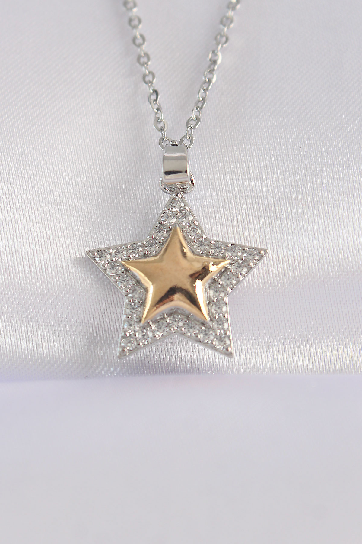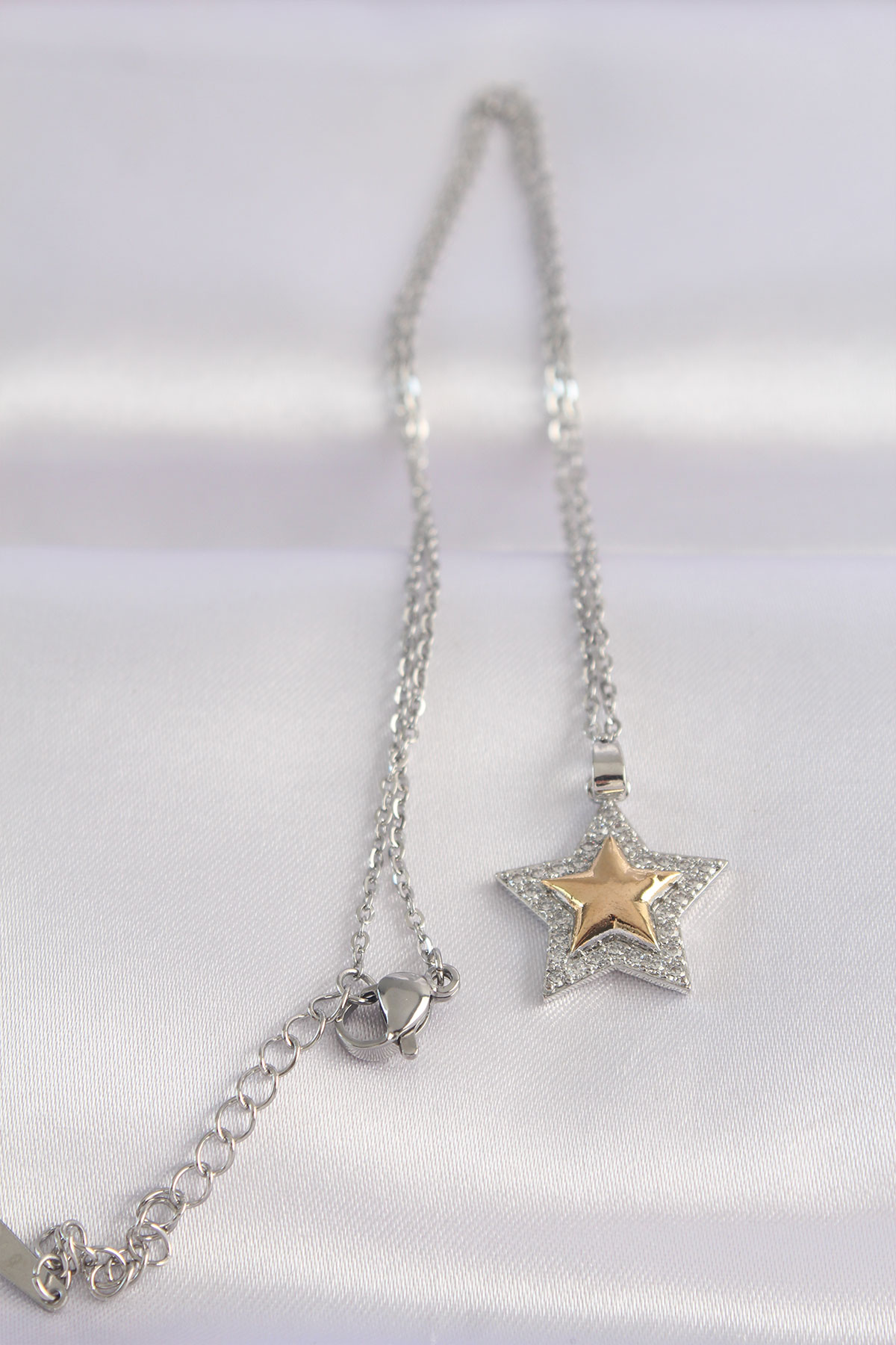 316L Çelik Zincir Gümüş Renk Zirkon Taşlı Tasarım Altın Renk Yıldız Kolye